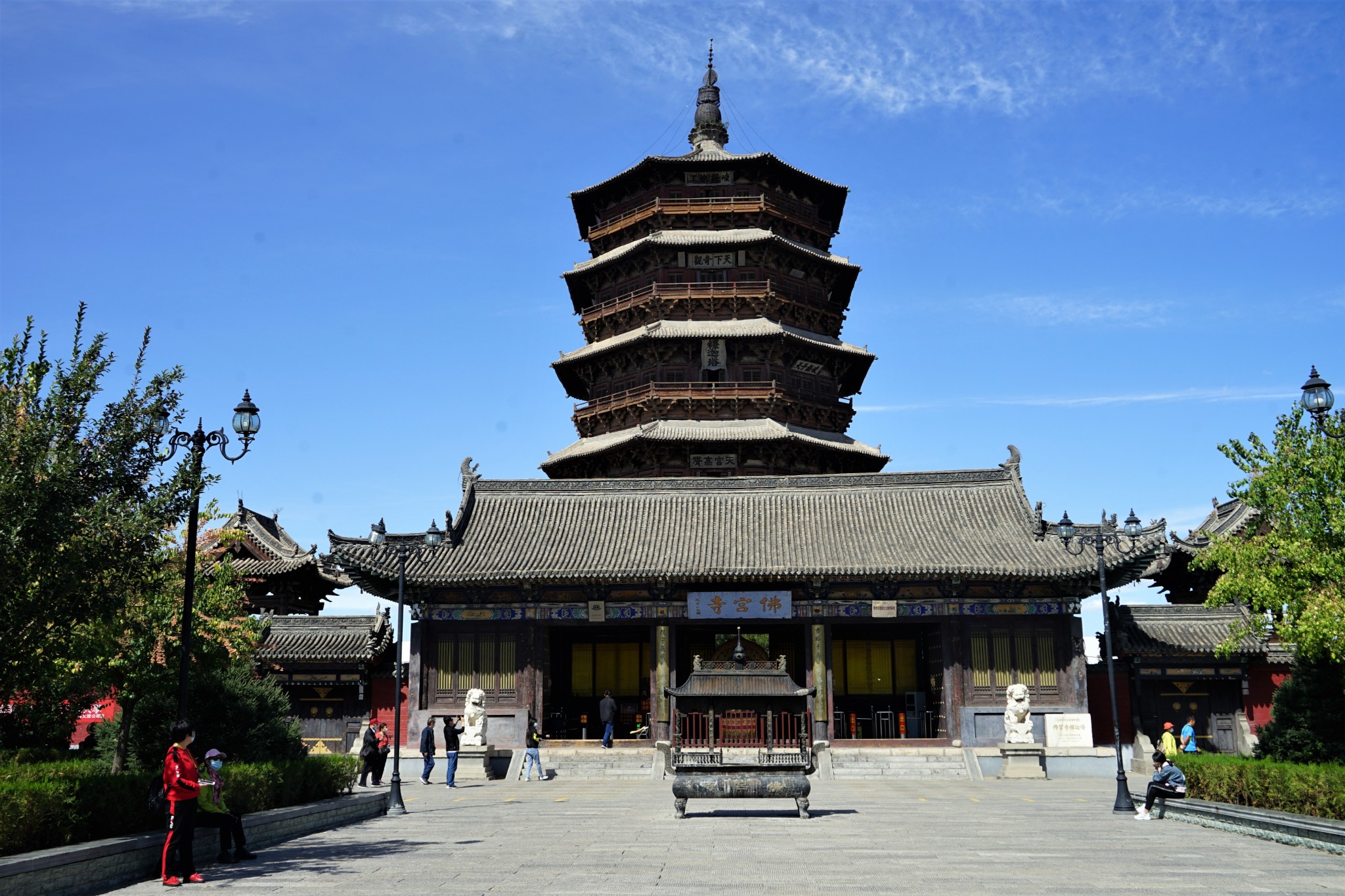 出云冈石窟驱车奔朔州,看应县木塔。应县木塔位于应县城西北佛宫寺内。是现存世界最古老结构的木佛塔。它与意大利比萨斜塔,巴黎埃菲尔铁塔并称世界三大奇塔。