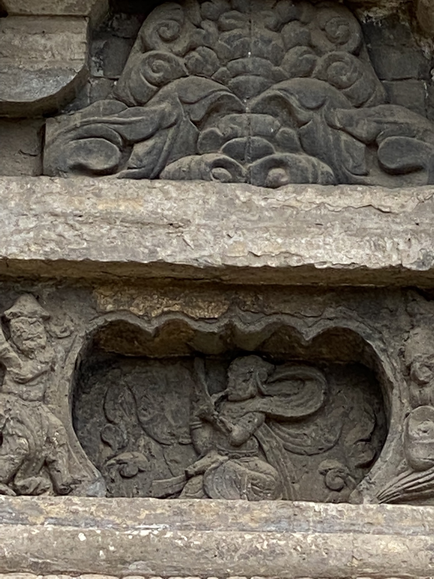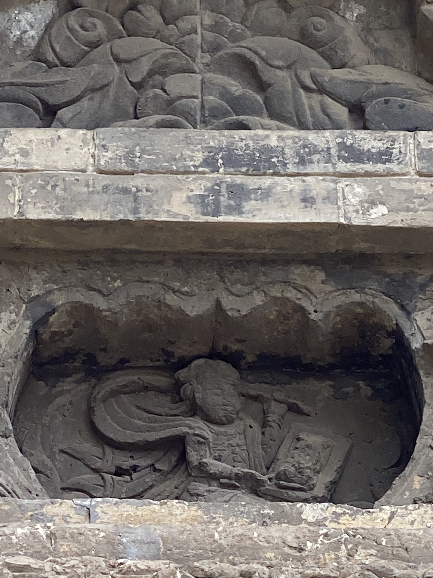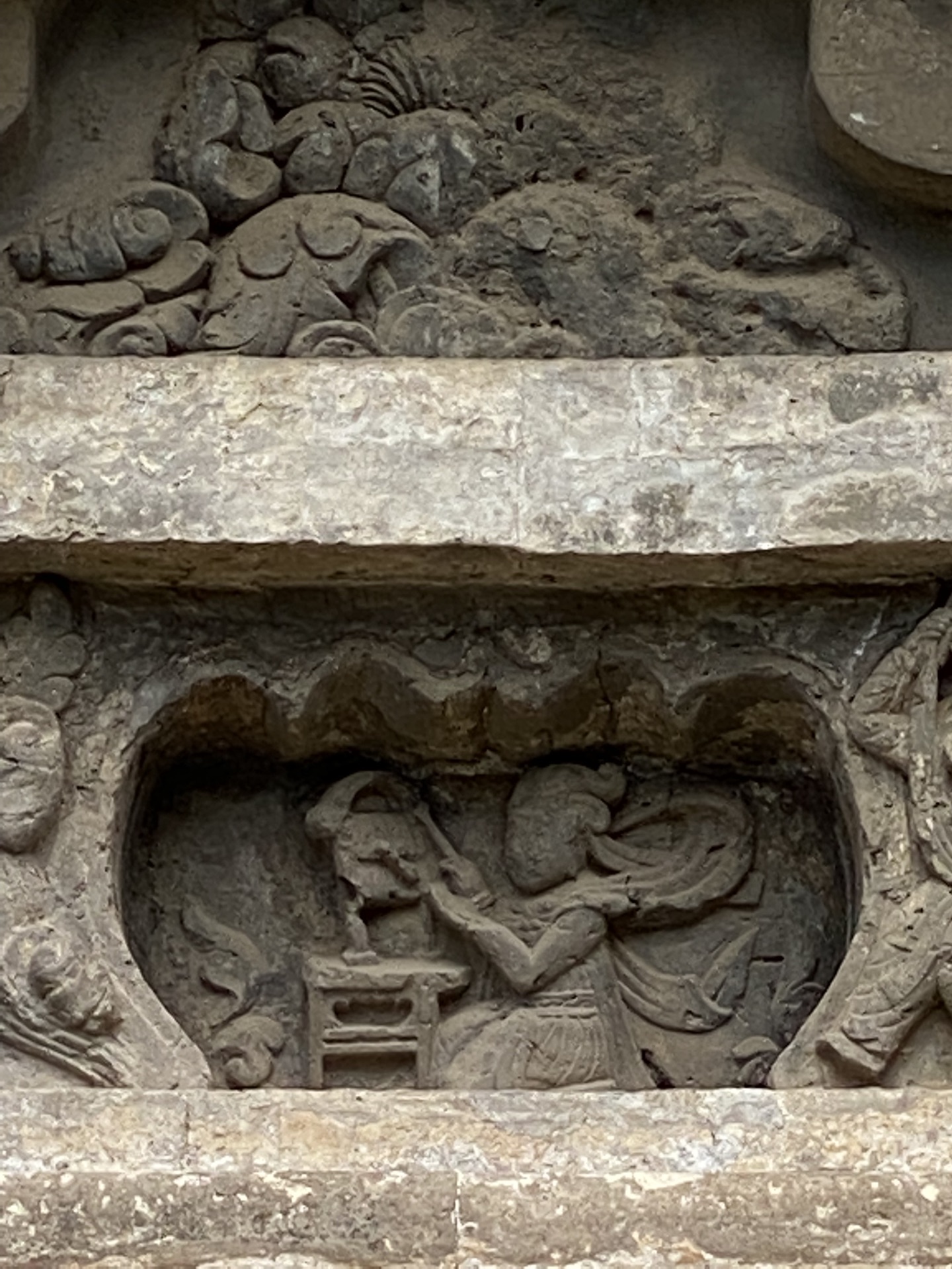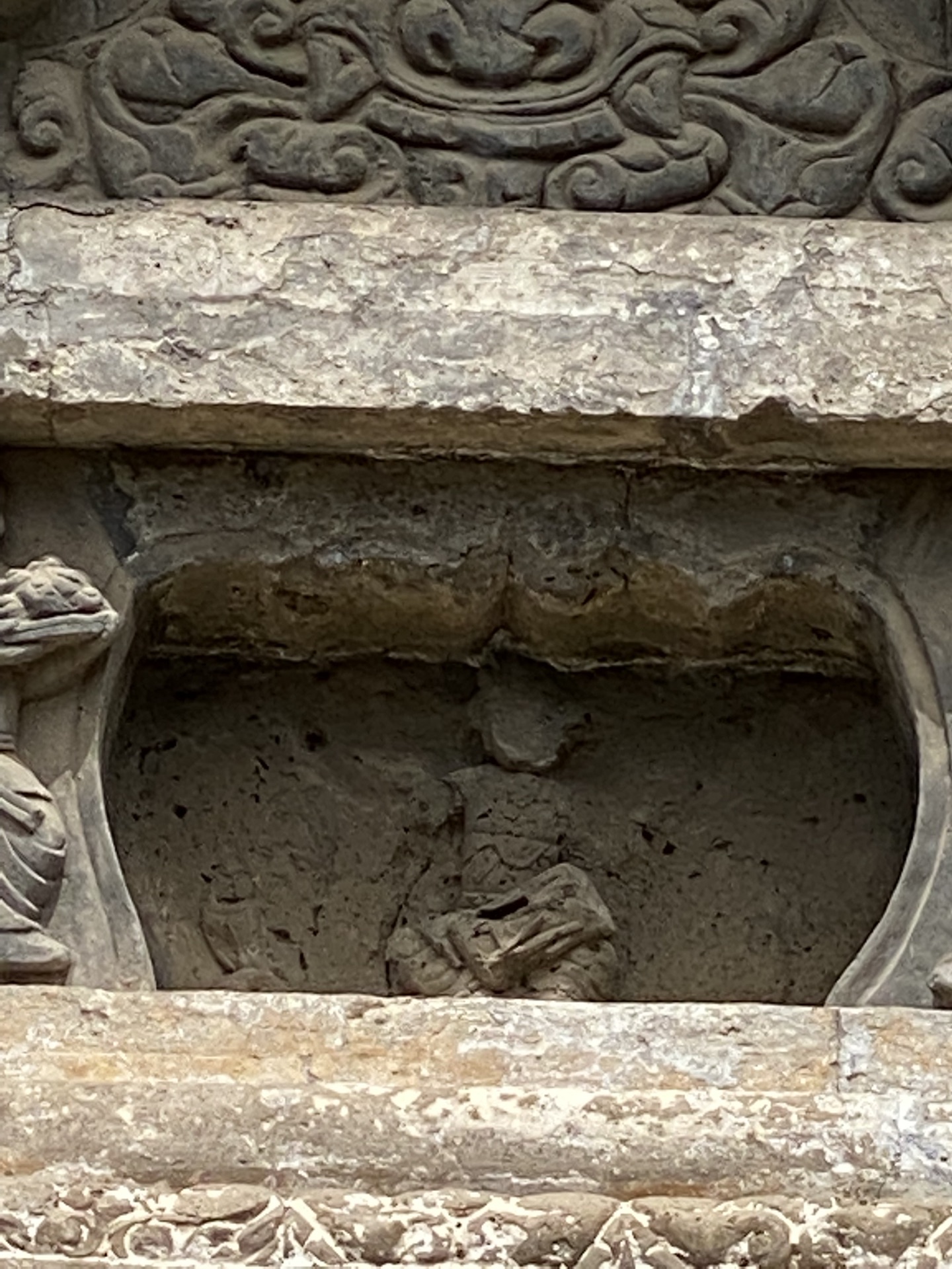 第二层为此塔最为精彩的部分,由于是平面八角形,共八个面,每个面辟壶门三个,共24个门,每个门内有一位乐伎人物砖雕,正在摆弄乐器,似乎在集体演凑着一曲佛音禅乐,这些乐伎雕像大多保存完好,他们形态各异,动作传神,衣带飘动,栩栩如生;在每个壶门两侧各雕一位侍者,他们手持不同器物,动作谦恭,表情温顺,衣饰清晰;八个檐角各雕一位力士,正弓腰收腹,奋力向上托举着塔身。
