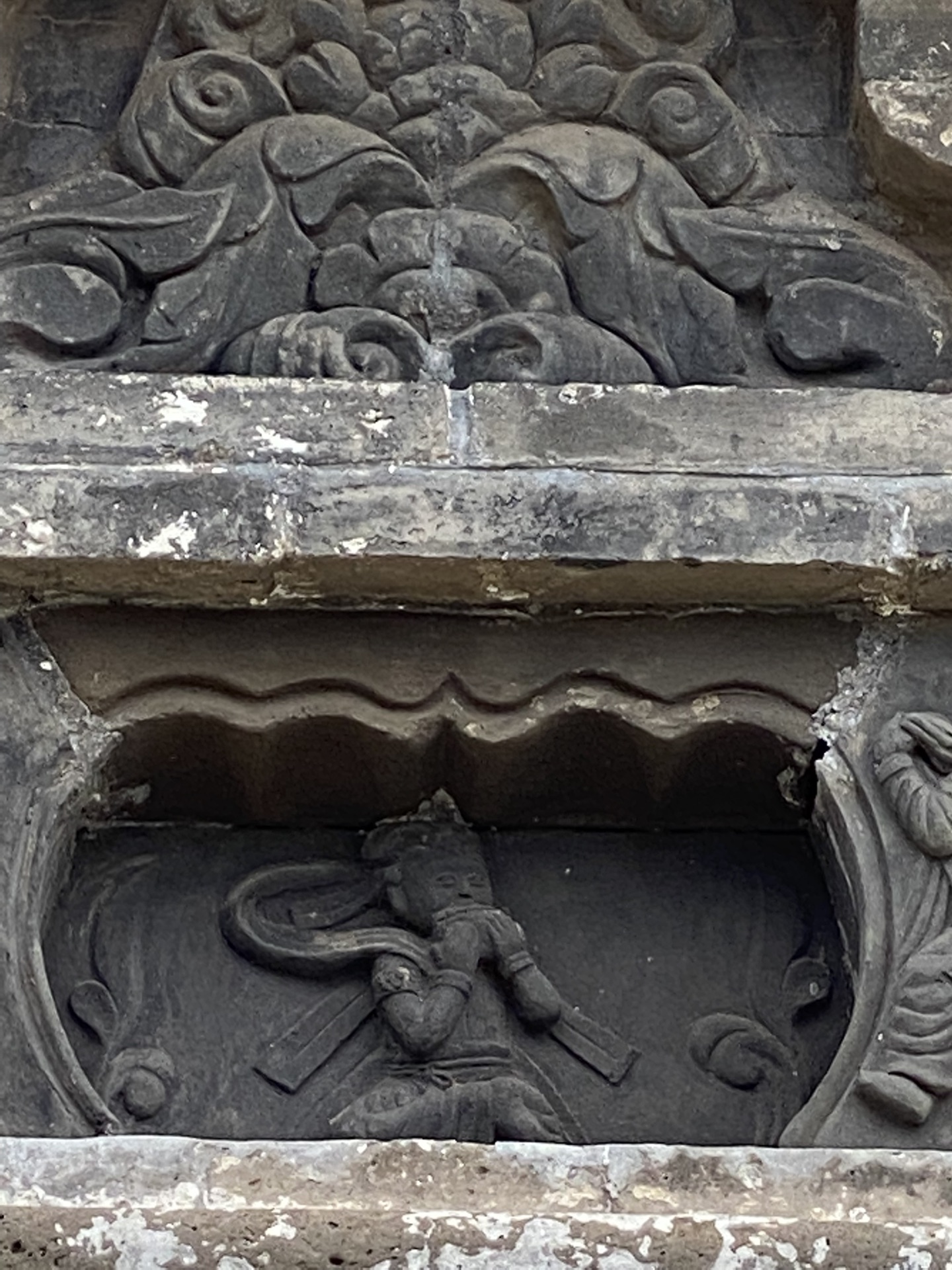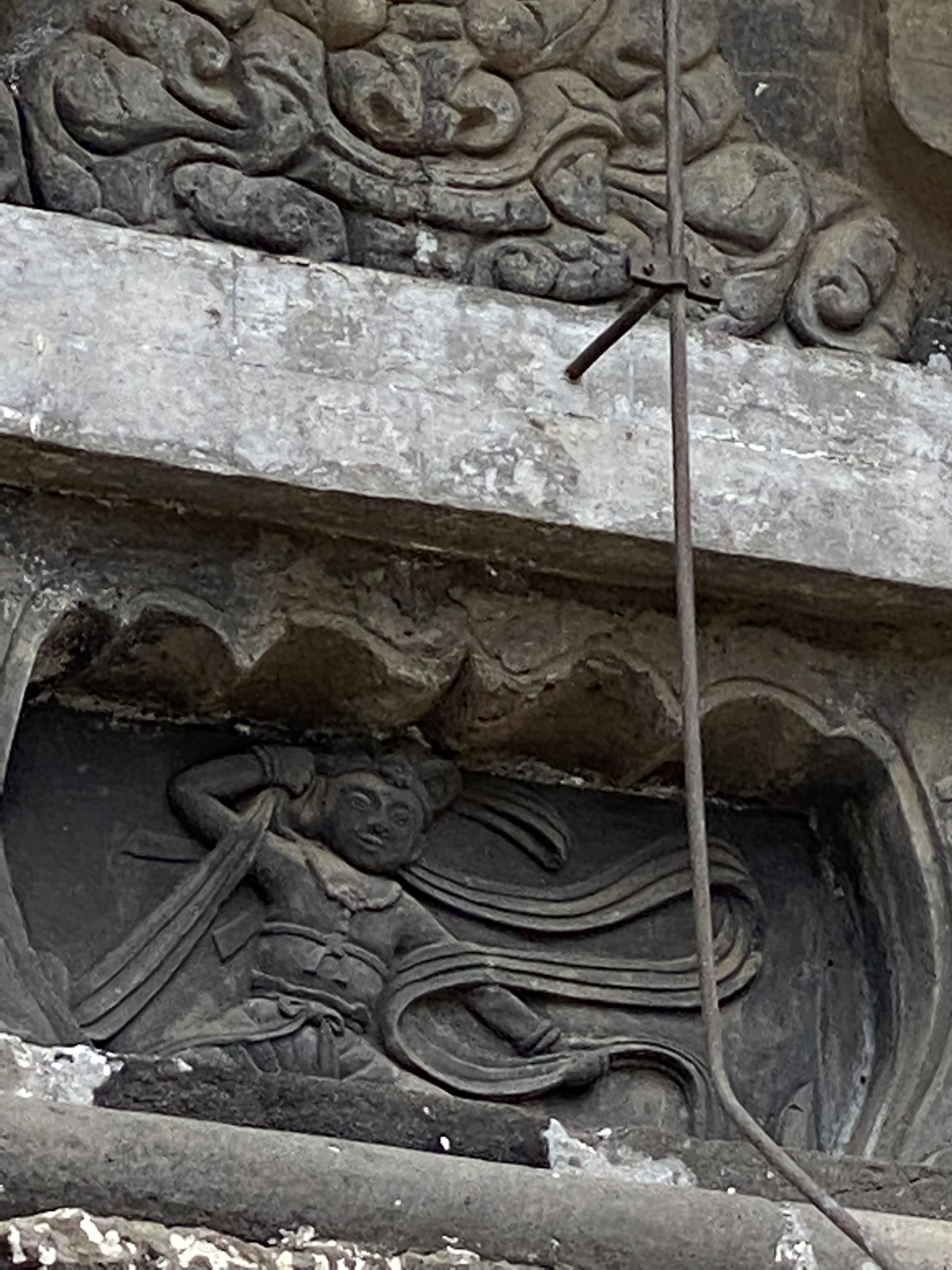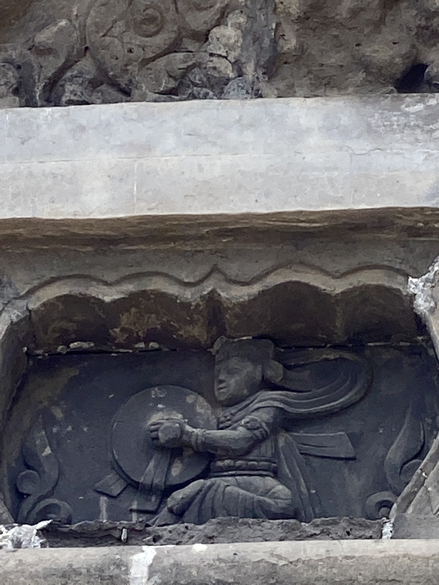 第二层为此塔最为精彩的部分,由于是平面八角形,共八个面,每个面辟壶门三个,共24个门,每个门内有一位乐伎人物砖雕,正在摆弄乐器,似乎在集体演凑着一曲佛音禅乐,这些乐伎雕像大多保存完好,他们形态各异,动作传神,衣带飘动,栩栩如生;在每个壶门两侧各雕一位侍者,他们手持不同器物,动作谦恭,表情温顺,衣饰清晰;八个檐角各雕一位力士,正弓腰收腹,奋力向上托举着塔身。