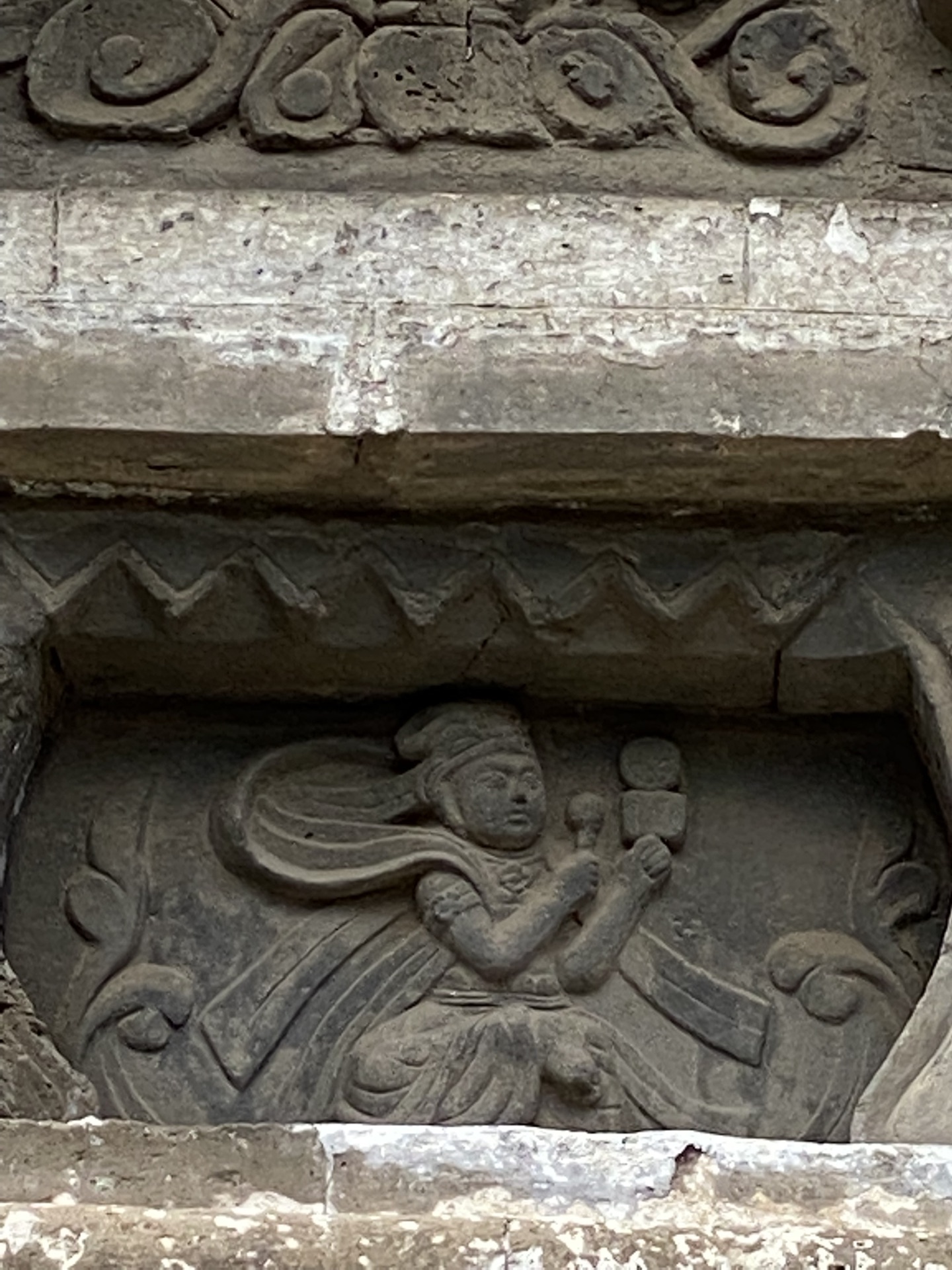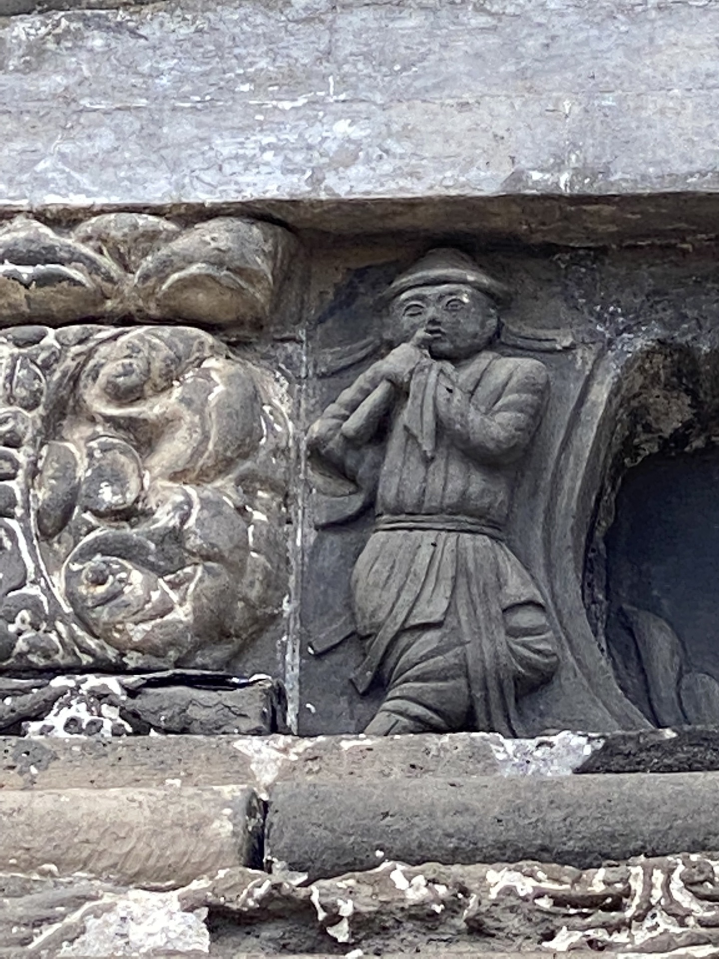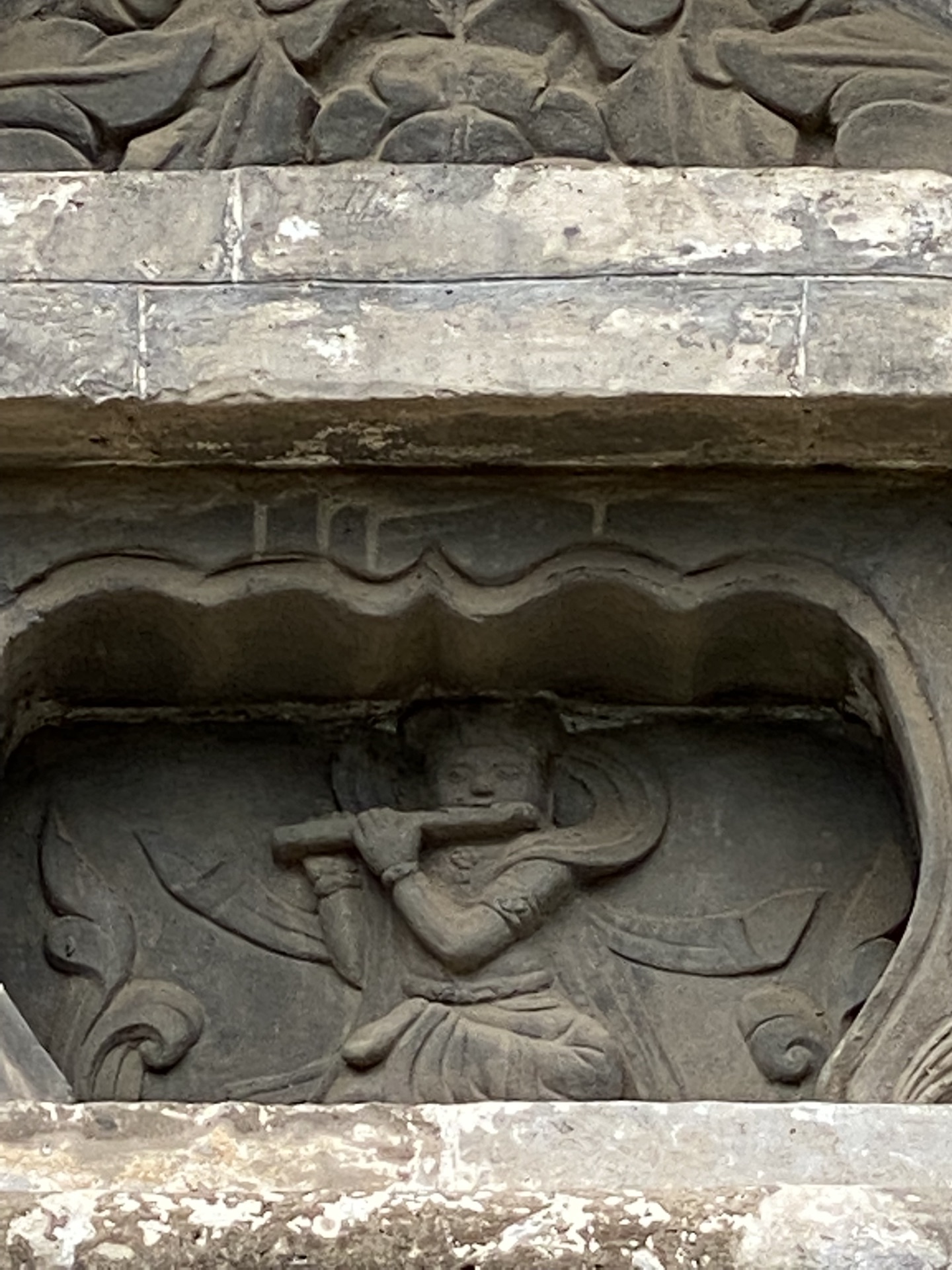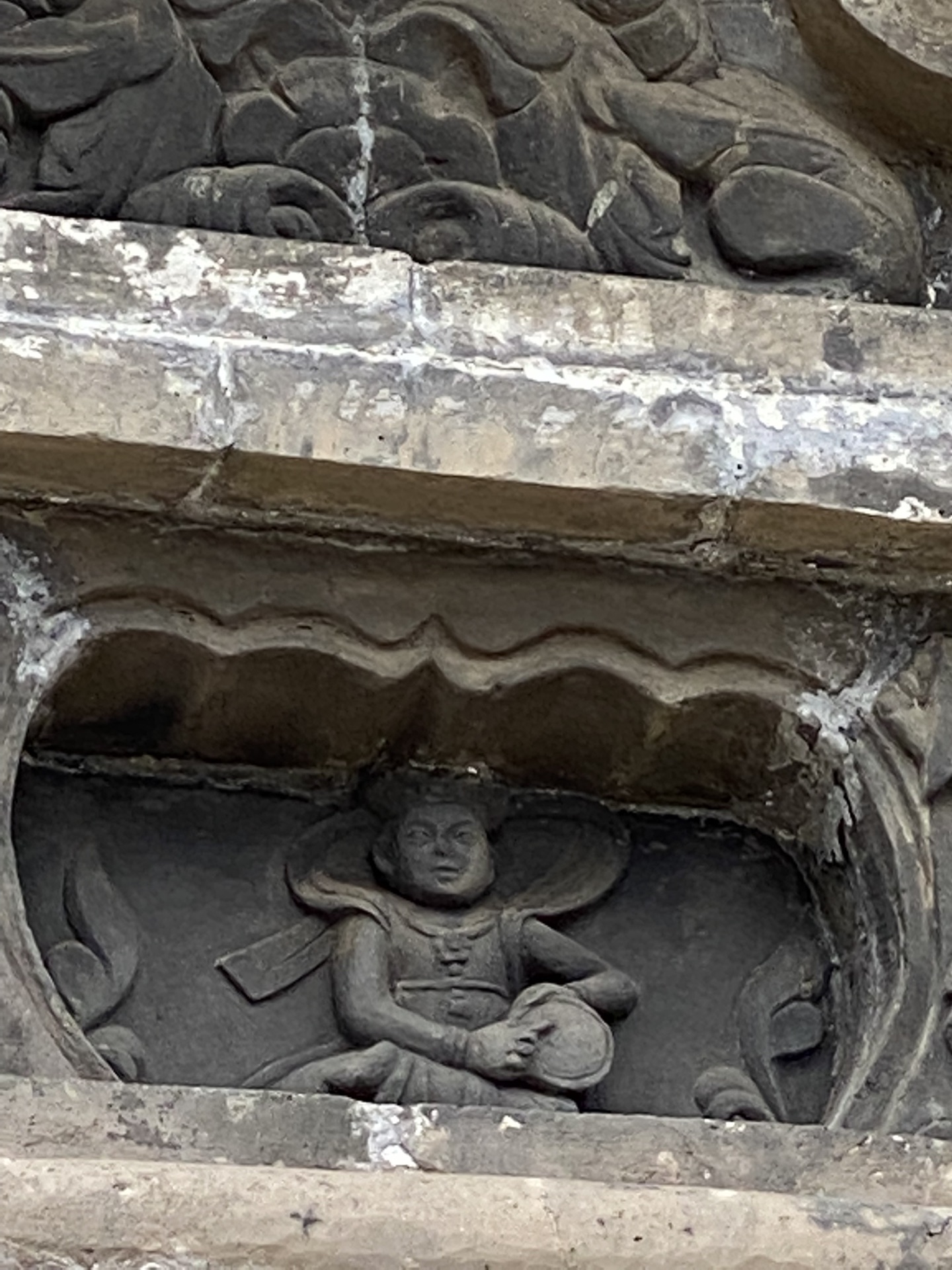 第二层为此塔最为精彩的部分,由于是平面八角形,共八个面,每个面辟壶门三个,共24个门,每个门内有一位乐伎人物砖雕,正在摆弄乐器,似乎在集体演凑着一曲佛音禅乐,这些乐伎雕像大多保存完好,他们形态各异,动作传神,衣带飘动,栩栩如生;在每个壶门两侧各雕一位侍者,他们手持不同器物,动作谦恭,表情温顺,衣饰清晰;八个檐角各雕一位力士,正弓腰收腹,奋力向上托举着塔身。