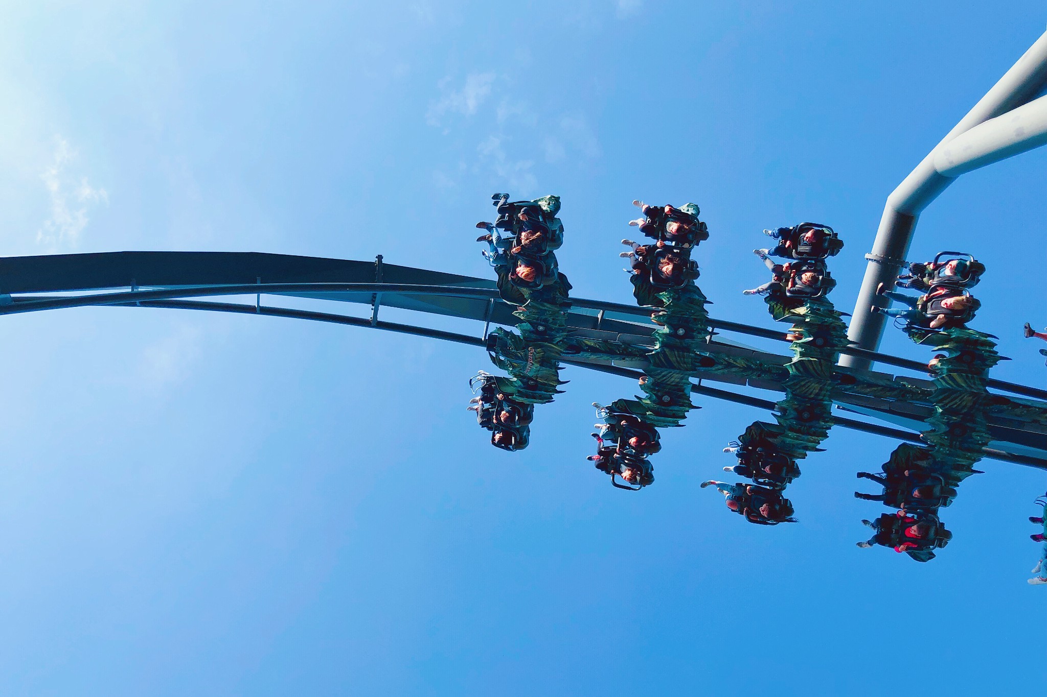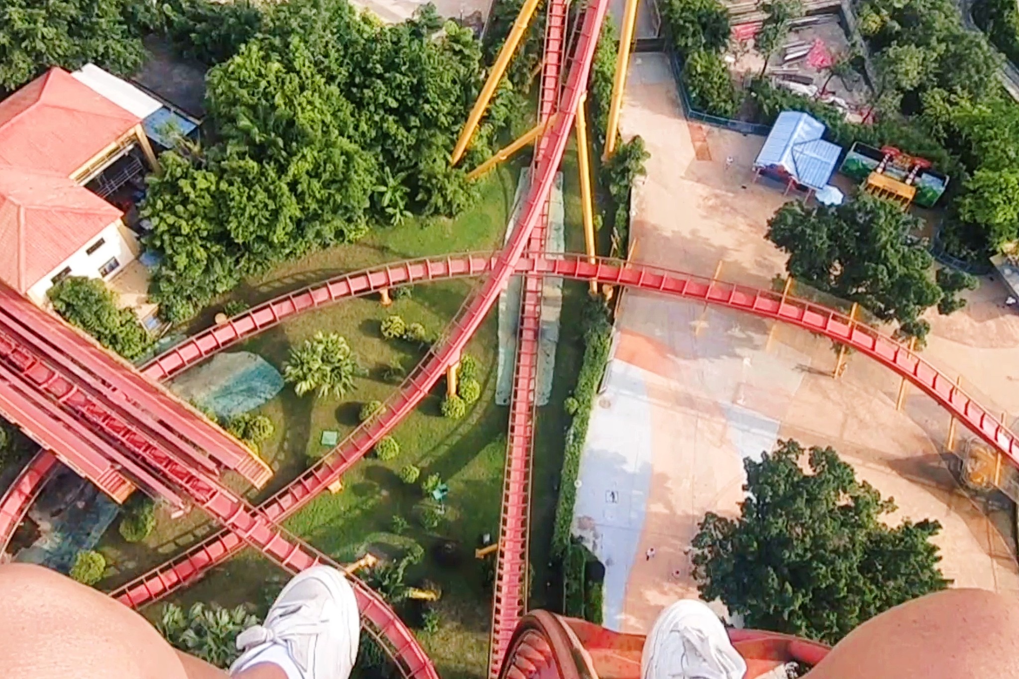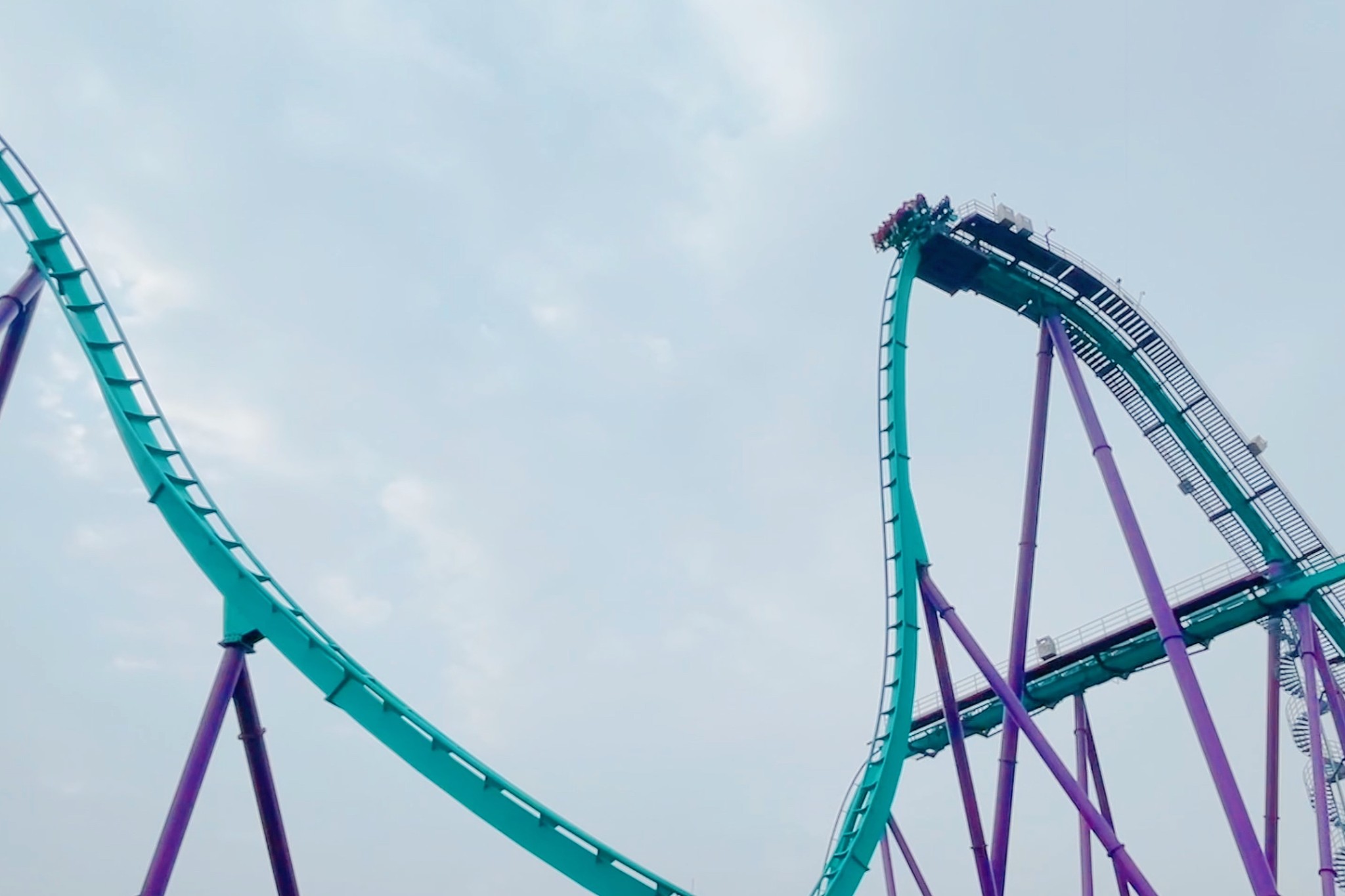随着轨道慢慢升至60米的顶点,我的心彻底提到了嗓子眼儿上,轨道尽头停顿的几秒,脚下就是60米高的垂直跌落,可以彻底把我送走...呼吸都已经调节不过来。瞬间释放的0重力跌落体验,让我整个人都飞了起来。