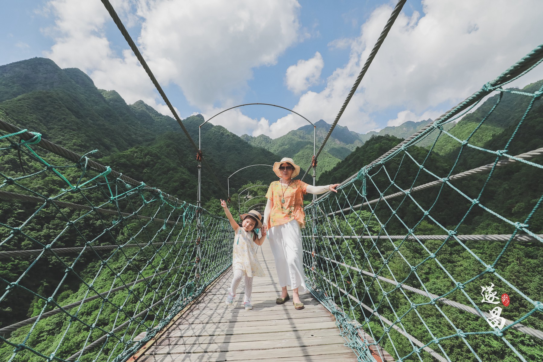 两岸青山,索桥飞架,仰头蓝天白云,谷底满目绿色,可以听见山泉奔涌,声势浩大,真是名副其实的“绿谷”。