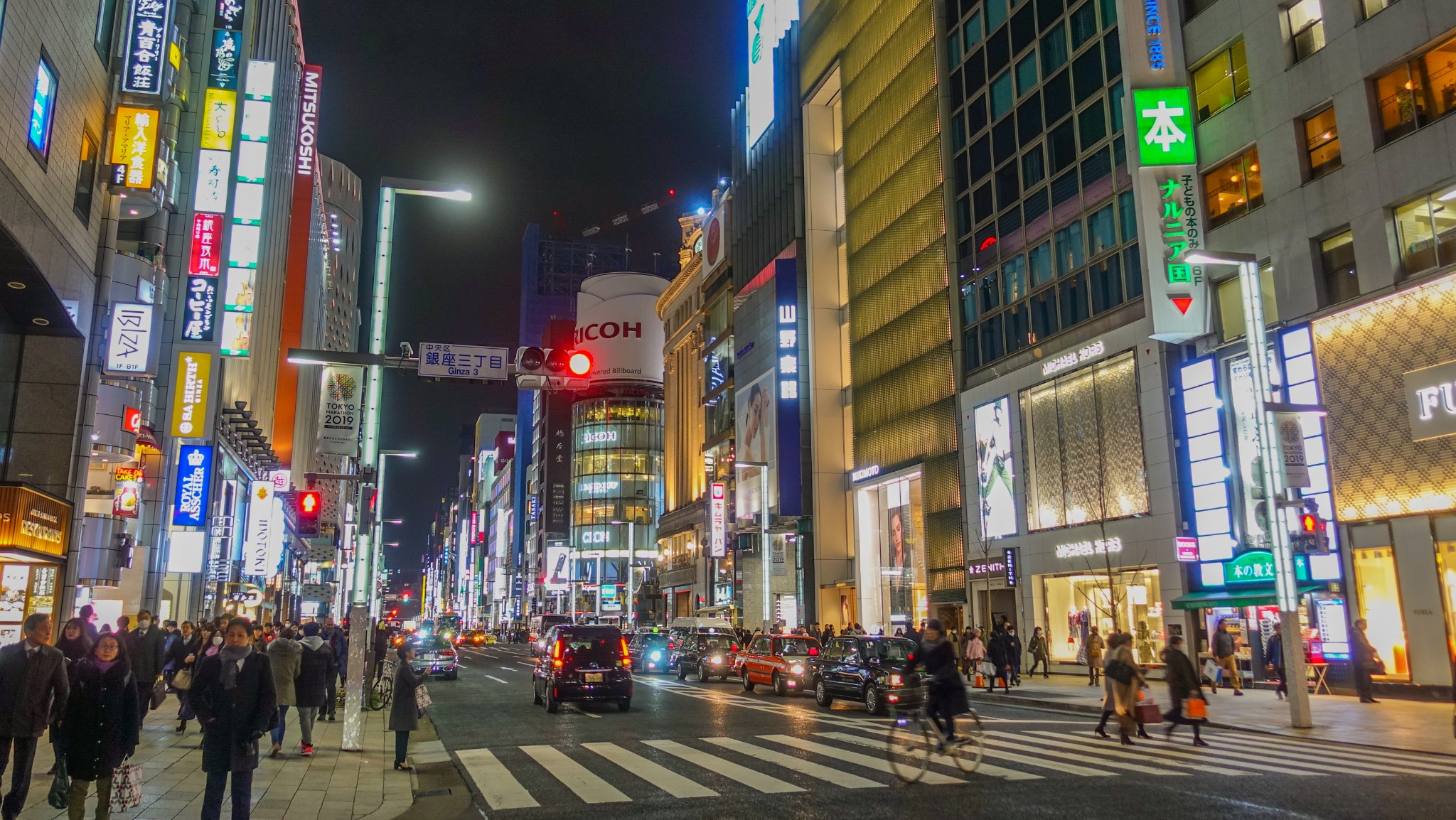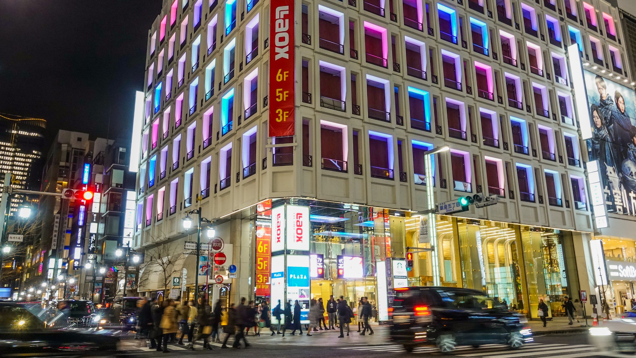 银座四丁目是银座商圈最为繁华的路口,每一次的红绿灯转换就像是给过马路的人群和车流打开了闸口。银座的地价在东京算得上最贵的之一,于是一栋栋的商店都看上去占地面积不大,瘦高瘦高的。