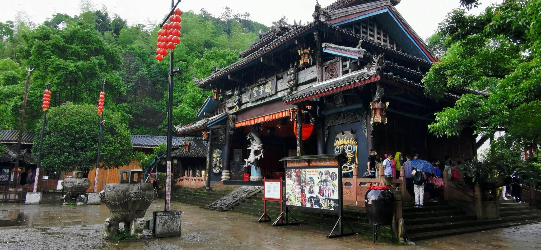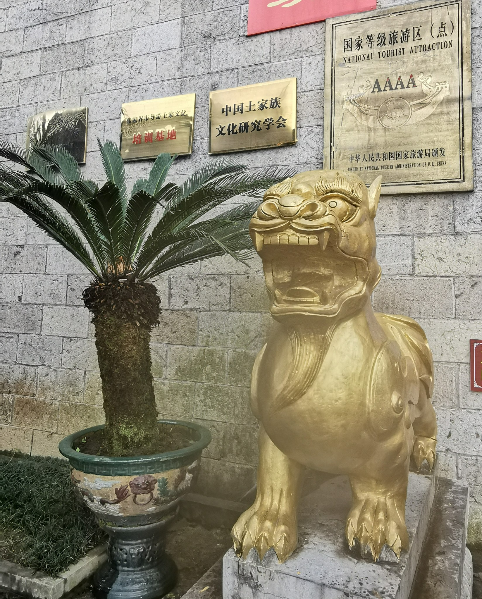 “摆手堂”是土家族人民祭祀祖先和跳摆手舞的地方。重檐结构的木质建筑矗立在红石砌就的座基上,远远看去比较大气。大堂两边除饰有人面虎,牌匾两侧还挂有人面龙。