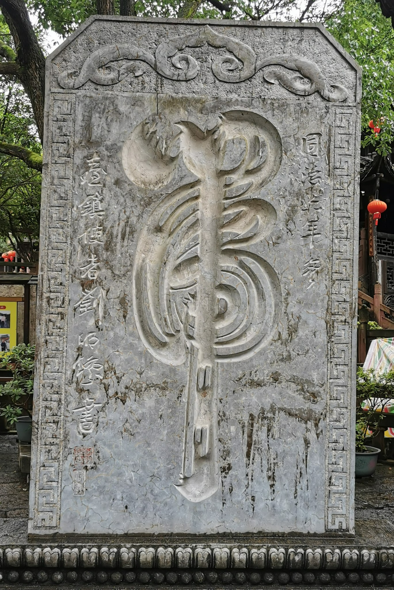 穿牌坊而过,便看到广场正中立有一根大石柱。石柱所立的基座四角,是四个挺身的汉子正在发力。大石柱是土家族顶礼膜拜的图腾,被称为图腾柱——这根擎天石柱高12米,直径为1.2米,上面用一笔连成的鲁班文写着 “ 汇集武陵精神,传承土寨风情 ” 十二个大字。石柱的顶部雕刻一只老虎,老虎是土家族的崇拜物。