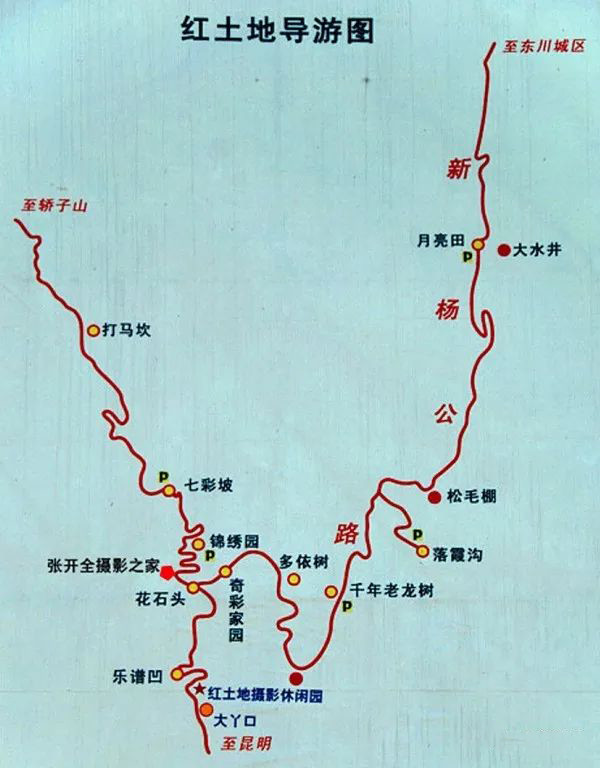 看到东川红土地的招牌之后,沿着昆绥线一路往前,就能在公路两侧依次看到锦绣园、乐谱凹、七彩坡、千年龙树和打马坎等景色,路旁宽敞处设置了观景台可停车观看。