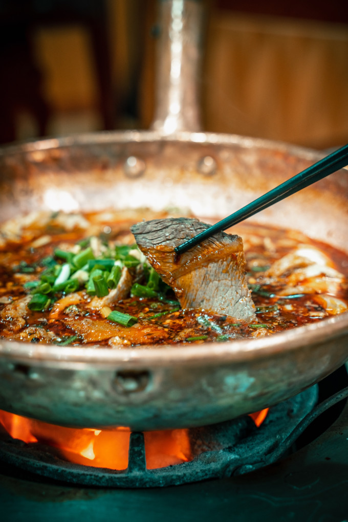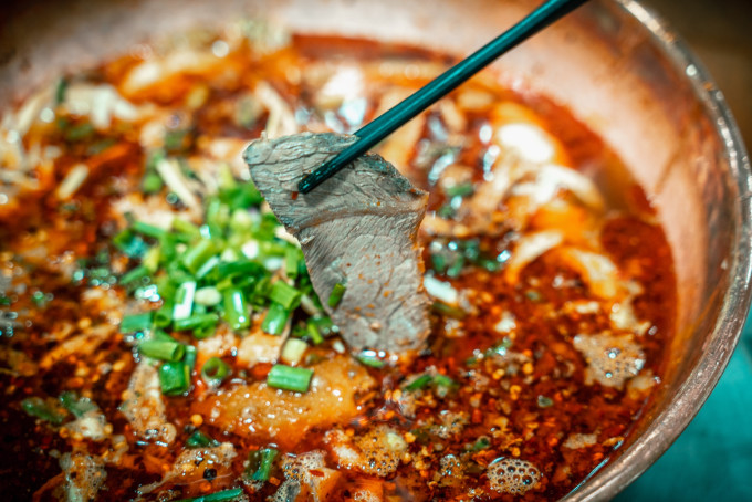 牛肉选用的是宜良山区的老品种黄牛,吃的是青草、喝的是山泉水,肉质紧实细嫩,煮炖、调味后再切作片状入锅,与辣椒花椒胡椒同煮,吃起来非常过瘾。