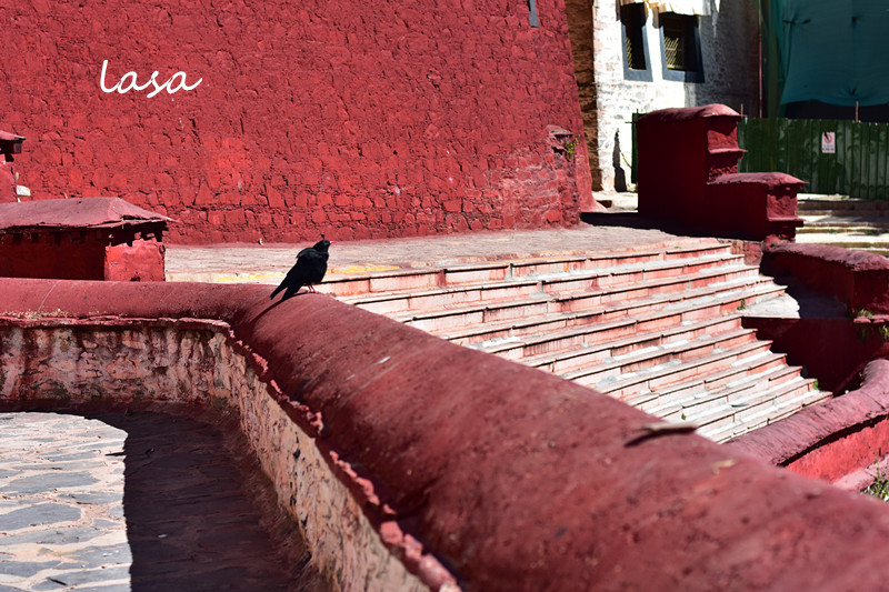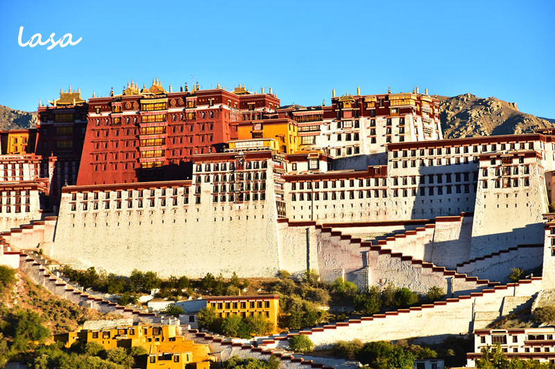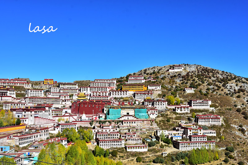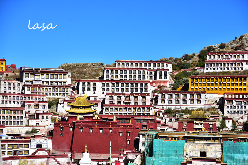 寺庙傍山而立,群楼重叠,巍峨壮观,红墙金顶背衬蓝天白云,是西藏风景的真实写照。