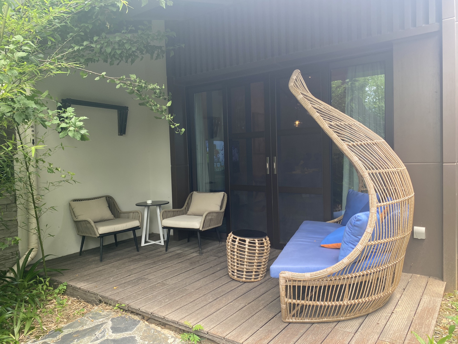 我们定的是套房,个人觉得性价比不高,其实定个普通房间足以,房间只是睡个觉,白天孩子在外面泡一天,大人可以在度假村里逛逛,逛累了可以去喝下午茶,从大堂往里走有个大露台(封面图片),景色非常好,适合大人在那里放空。