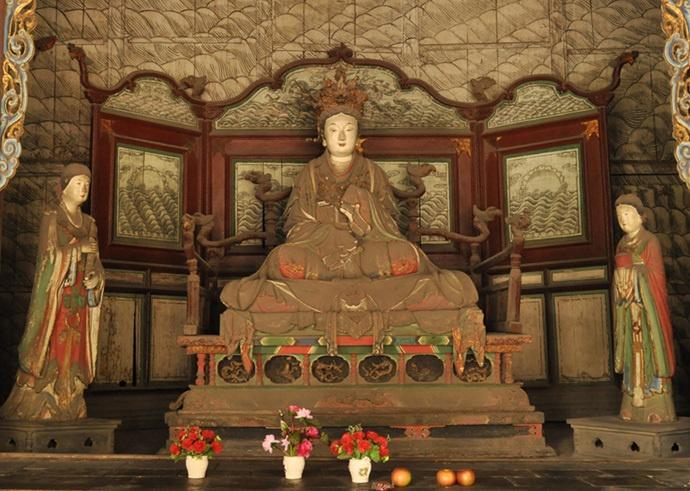 所以彩塑已经完全被保护起来了,要隔着栅栏大概五六米才能拍到圣母殿里的场景