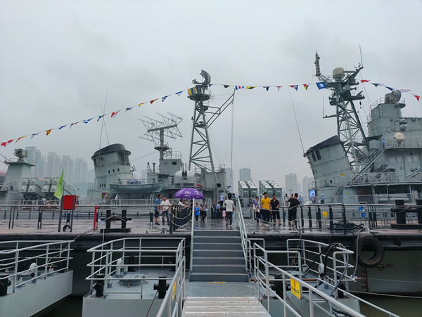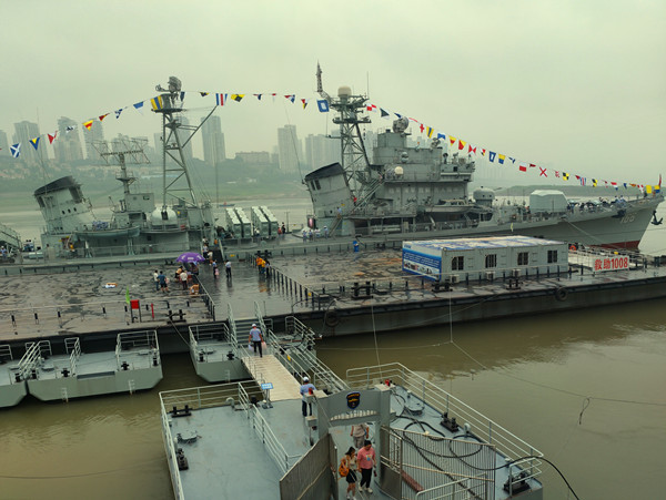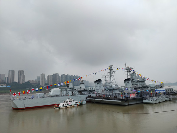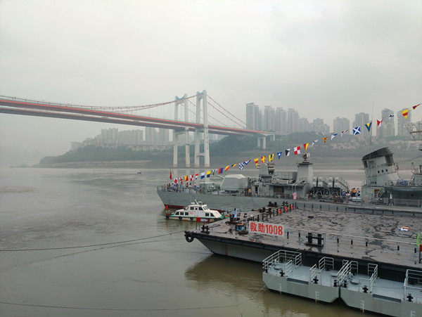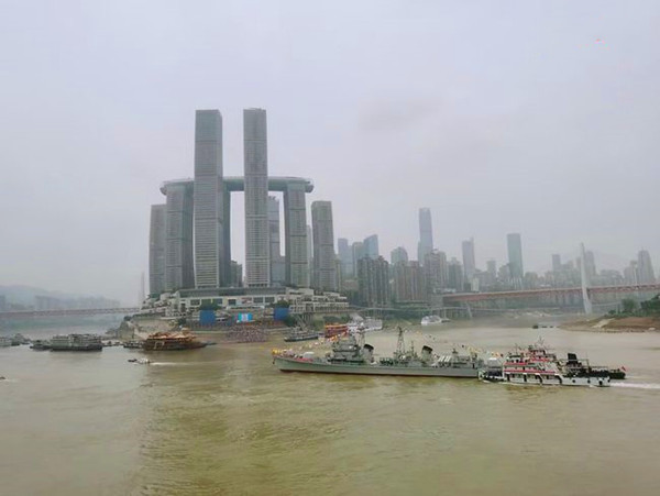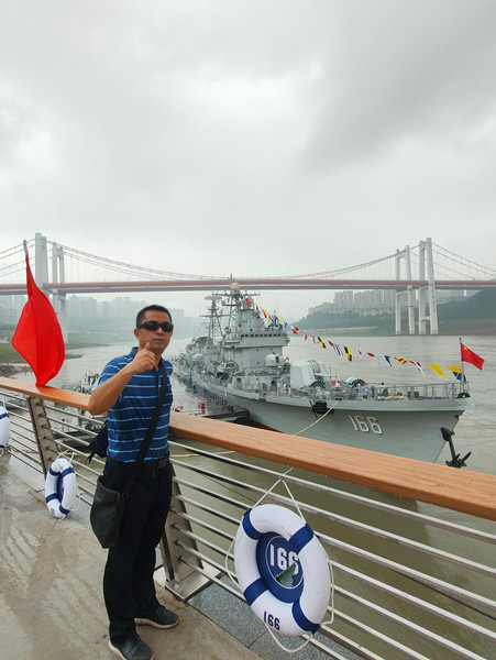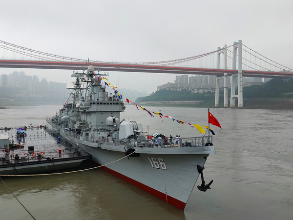 “荣誉之舰,英姿入港”。2021年6月26日,166舰在拖轮拖拽下从重庆南岸区明月沱码头溯江而上,历时8小时,途径广阳岛、铜锣峡、寸滩长江大桥、朝天门、东水门长江大桥、鹅公岩长江大桥等地,在长江两岸民众的热切关注下,顺利抵达建设码头。至此,166舰完成长江航道所有航程,结束了302天的“旅程”,正式“安家”重庆