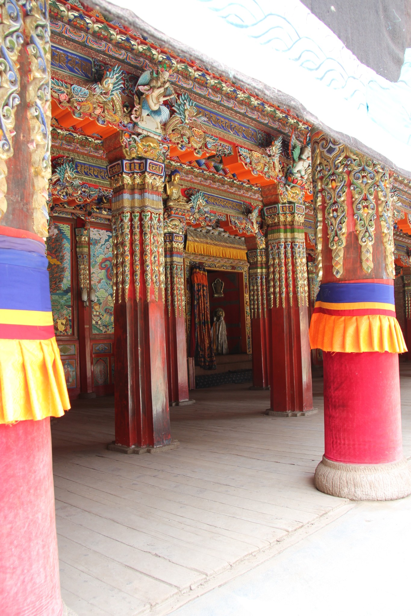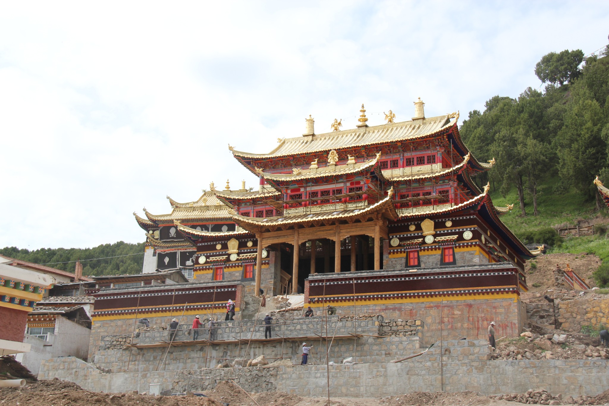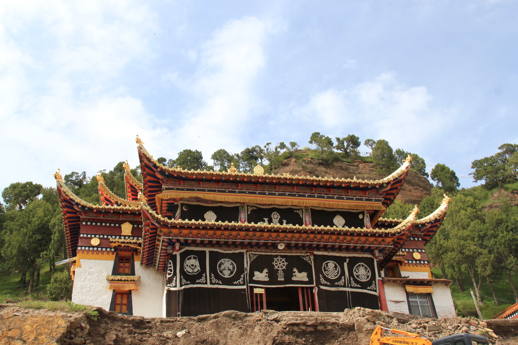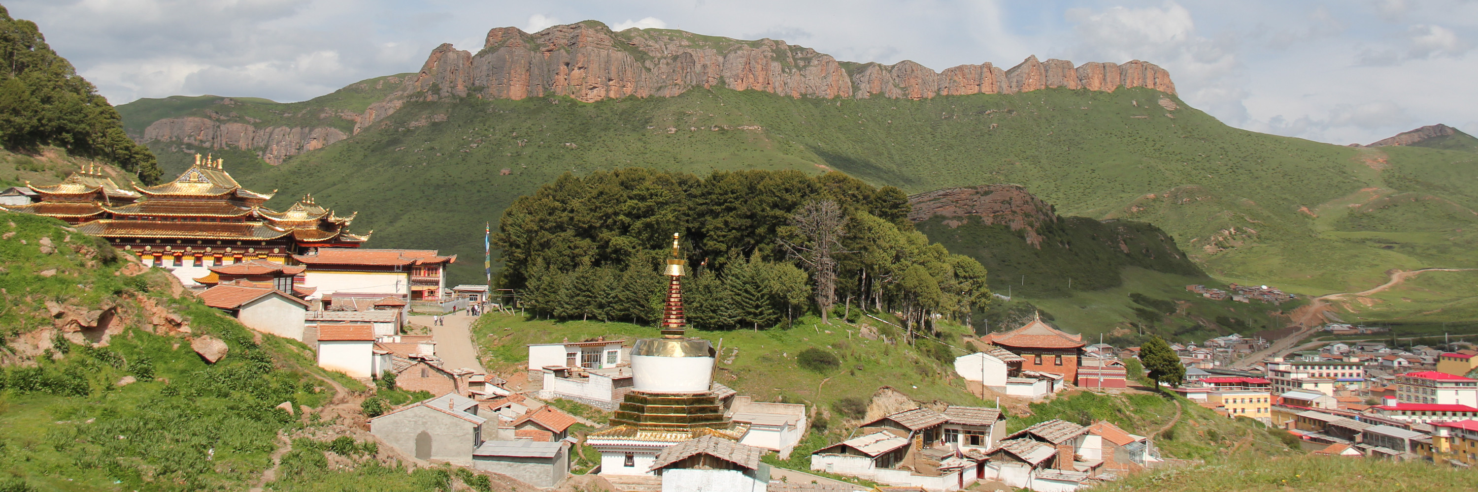 办完住宿手续后即开车1公里去朗木寺。郎木寺创建于1748年,是藏传佛教(格鲁派)最大寺院之一。寺院地处甘、青、川三省交界的白龙江源头,自然风景独具特色。我们依次参观郎木寺大经堂、弥勒殿、金瓦殿、白塔、晒佛台等,然后沿左边的盘山道路步行去看天葬台。