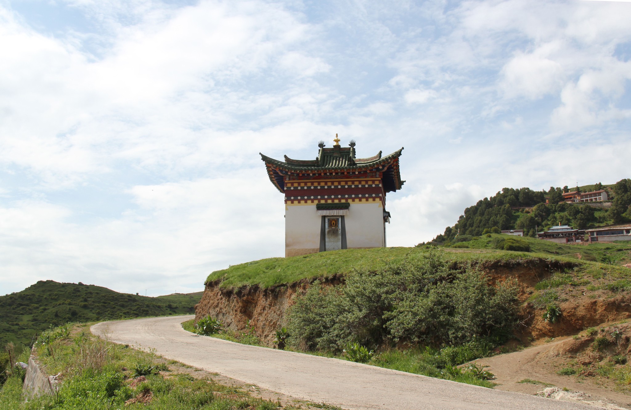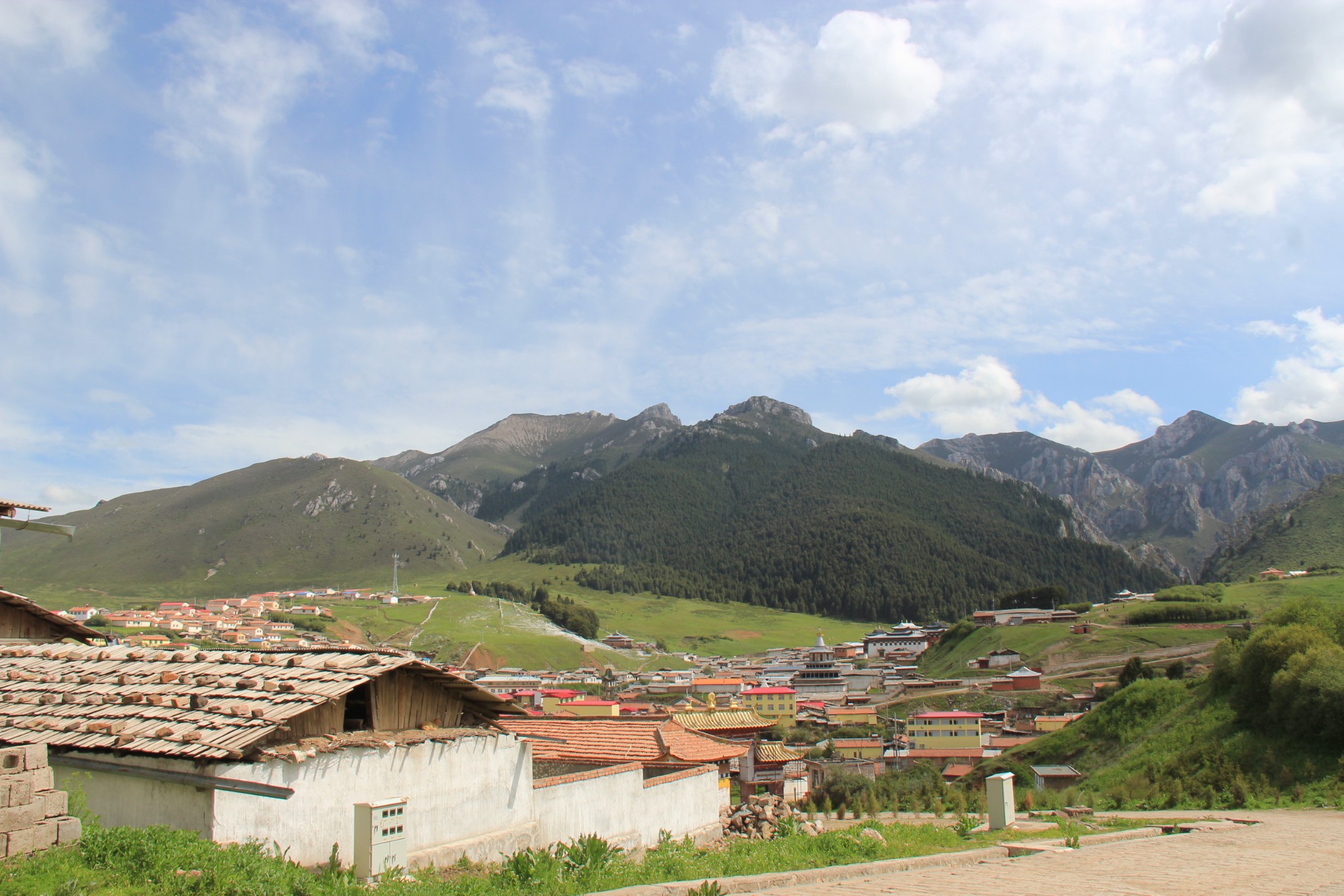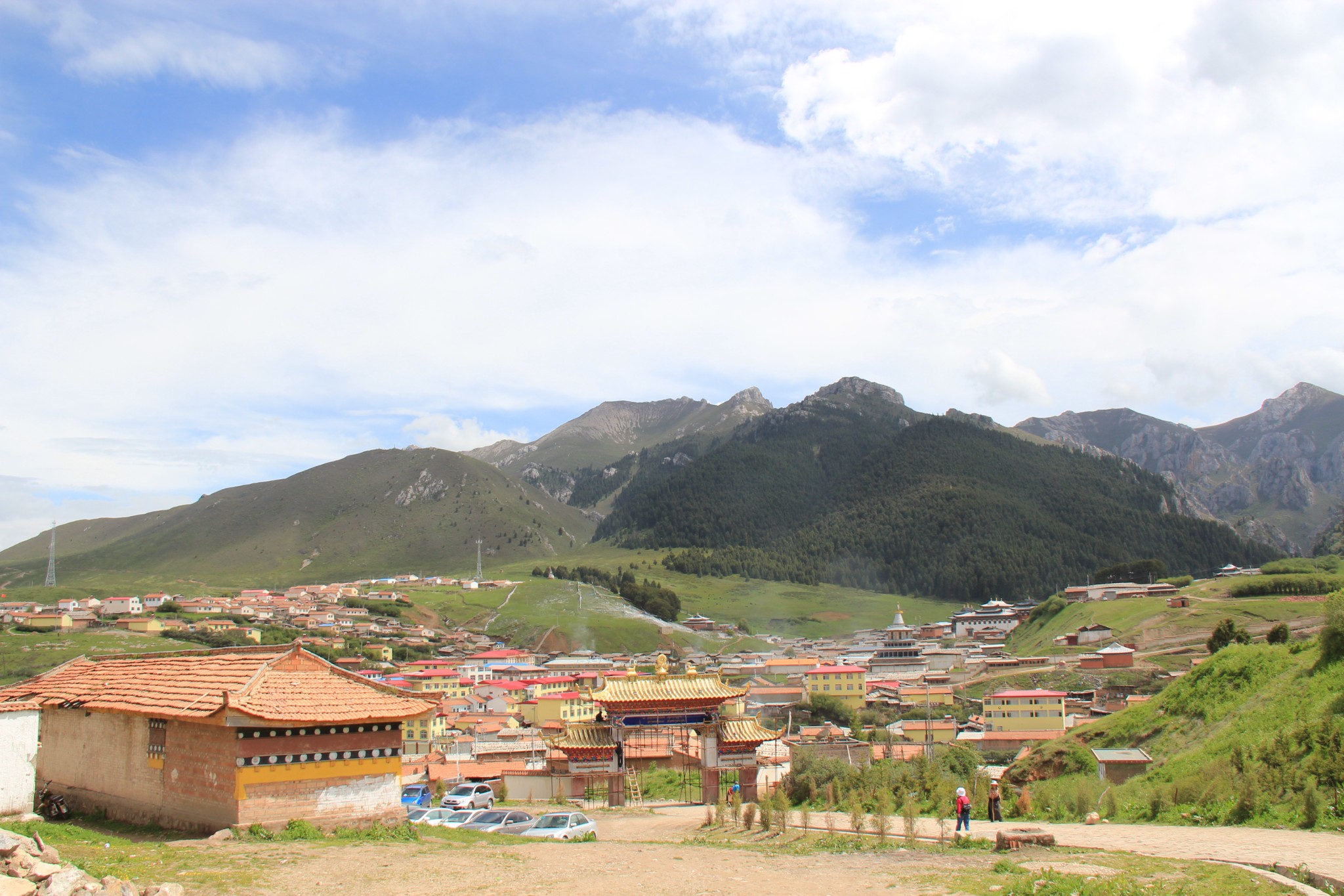 西北自驾游第33天(6月16日),游完尕海湖继续走213国道,一路仍是甘南草原风光,行驶40公里到郎木寺镇(属甘南藏族自治州碌曲县,海拔3350米),下午3:30入住甘肃达仓郎木宾馆,后院有停车场。