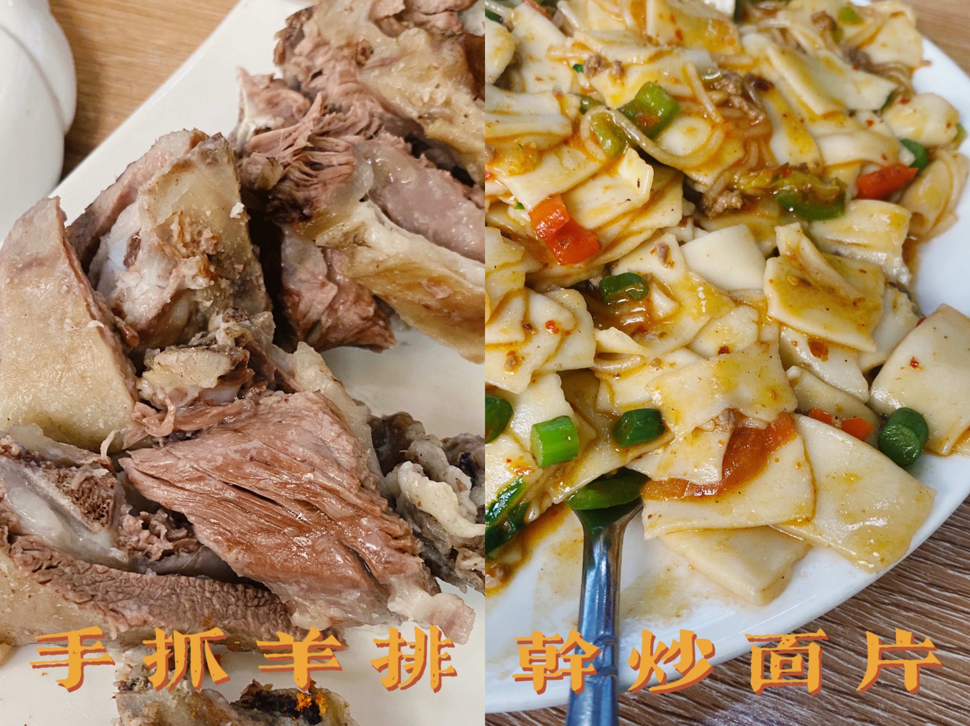 我们一起点了一份手抓羊排、干炒面片、还有一份时蔬。手抓羊排虽然看着很腻,但是吃起来意外的不膻,面片也很有嚼劲,吃起来跟内地真的差别太大,直接改变了我对兰州拉面的看法,关键是分量超级大,我们俩吃到撑都没吃完!