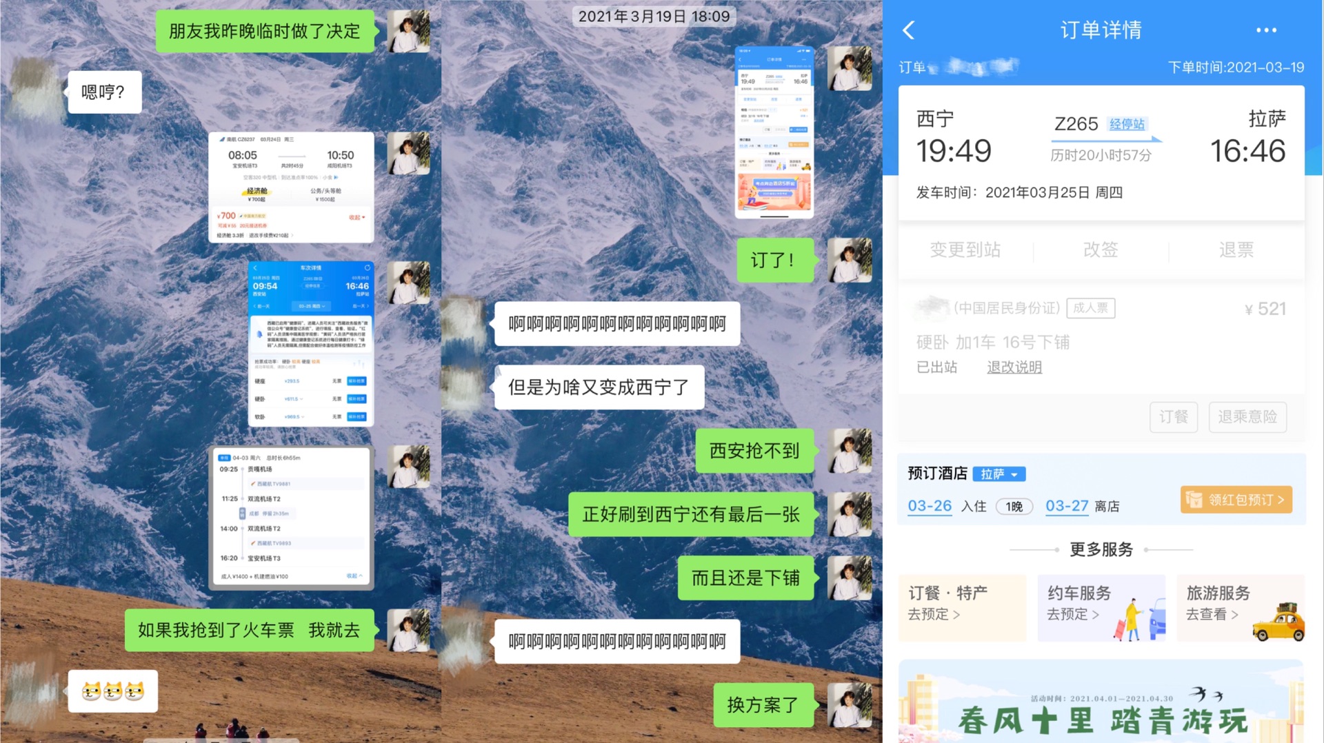 在准备放弃出游计划开始找工作的时候,偶然的一天早上看见西宁到拉萨突然多出一张卧铺票,想都没有想赶紧先付了款,再仔细一看,出发时间是——5天后。