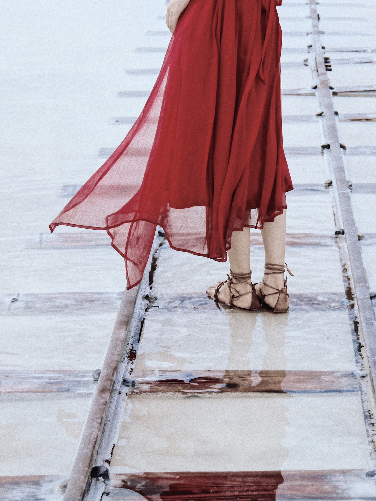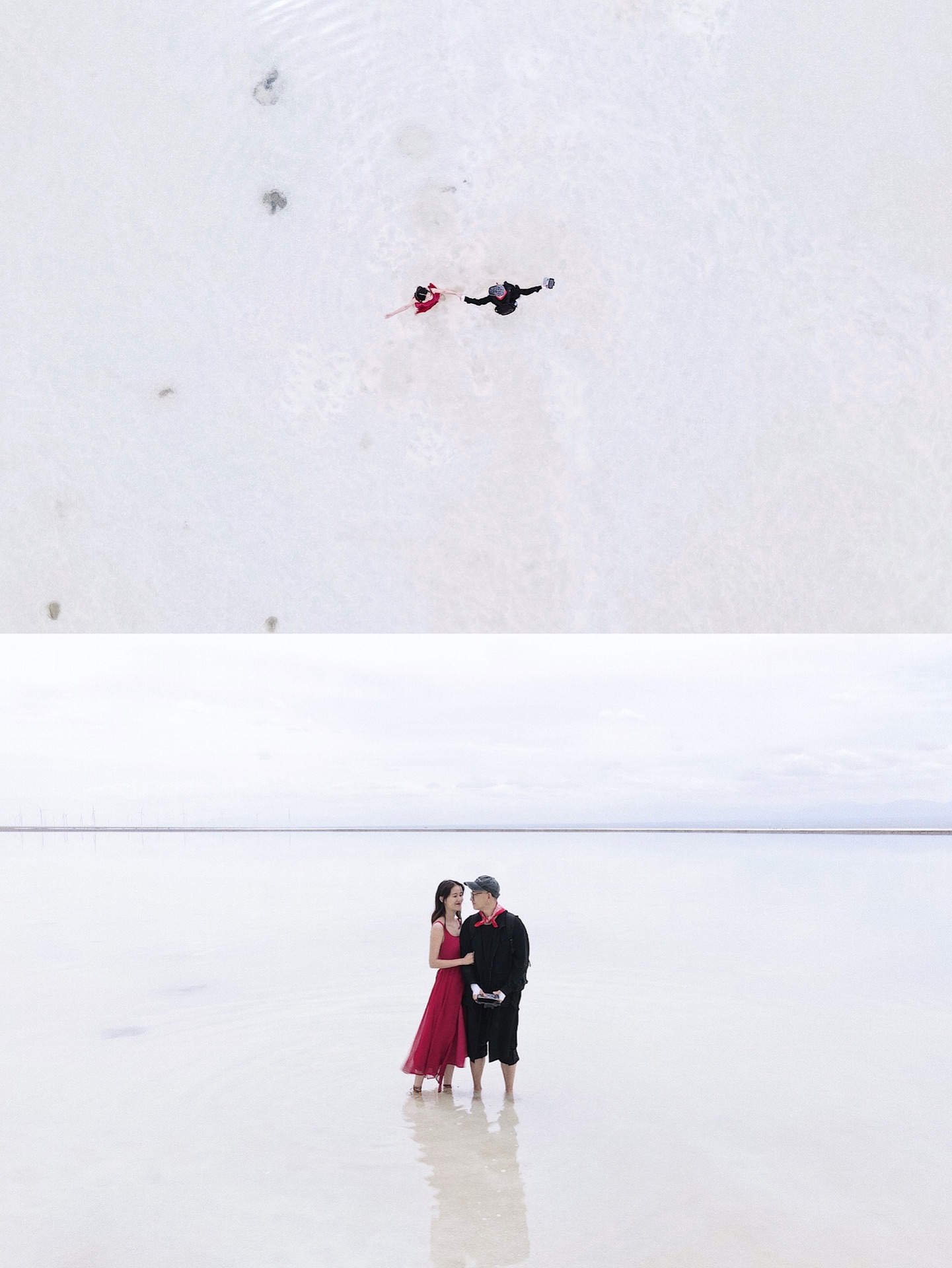 盐池的结晶层还是比较脆弱,一个不小心就踩出个黑窟窿。所以建议不要穿拖鞋下湖,容易被“吞”,不要问我是怎么知道的。现场可以租鞋套,10元一双,就是影响拍照美观。
