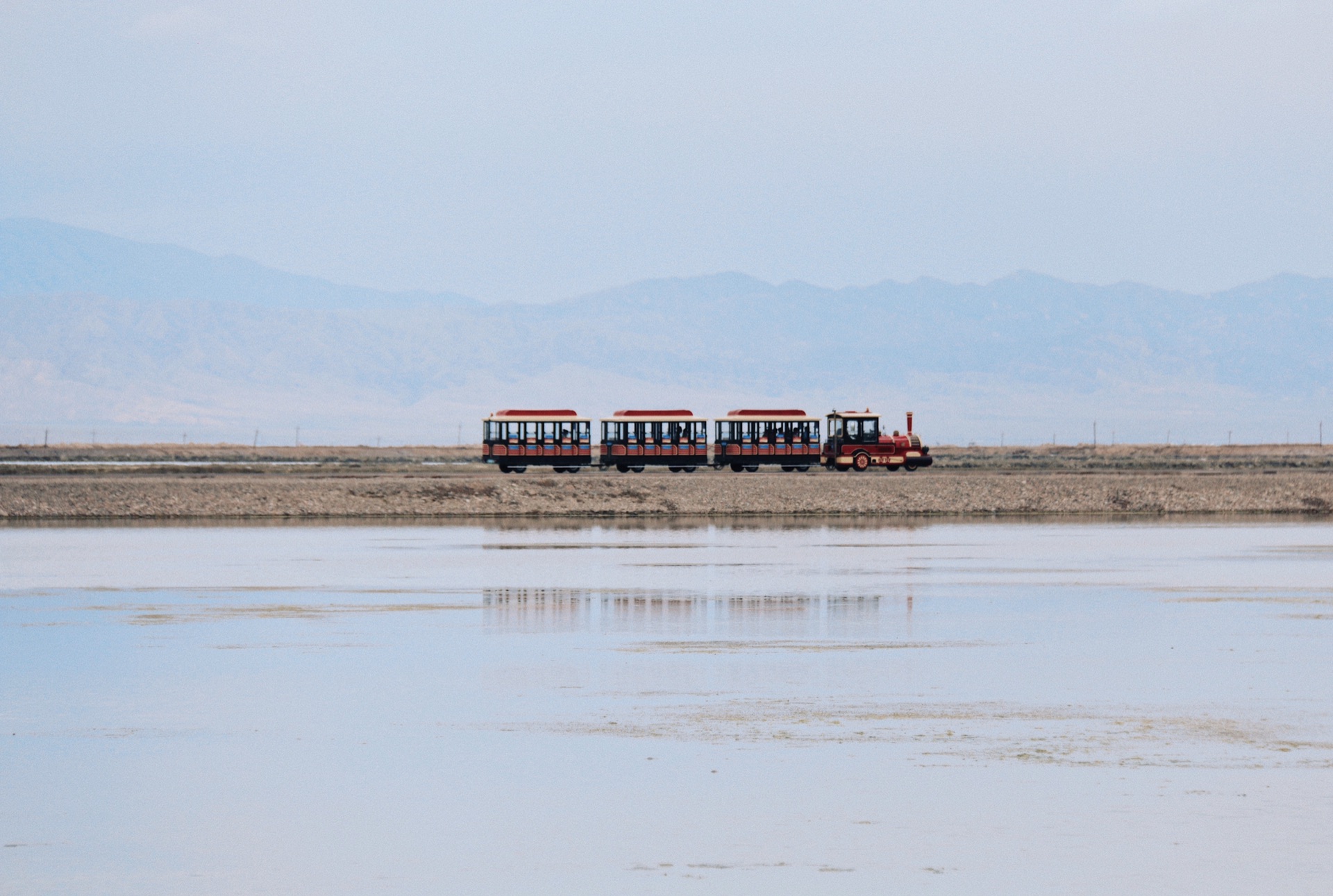 好了,下面回到现实。天气直接决定了茶卡是否惊艳。当天运气不好,多云,少了镜面的感觉。人群主要聚集在第一个站点,左右两个小火车一个被游客占据,一个被婚纱摄影占据,很难蹲到一个机位。