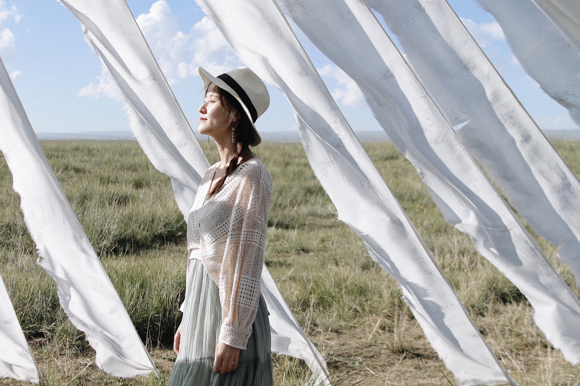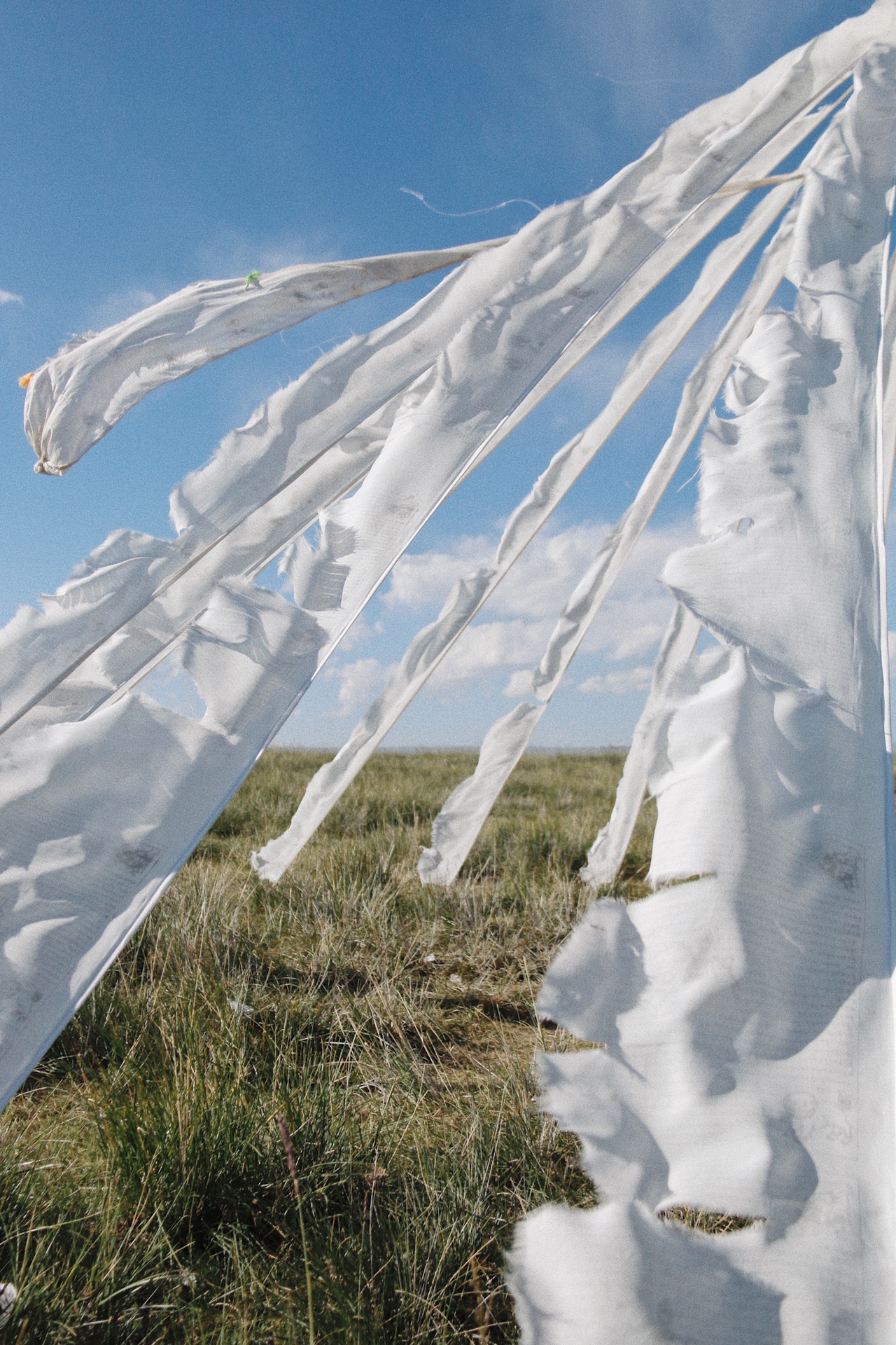 断崖边象征白云和纯洁的,十分少见的纯白色经幡。风扬起,和背景里的白云遥相呼应。