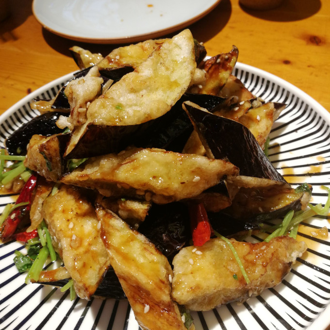 茄子有点像拔丝的做法,很好吃。