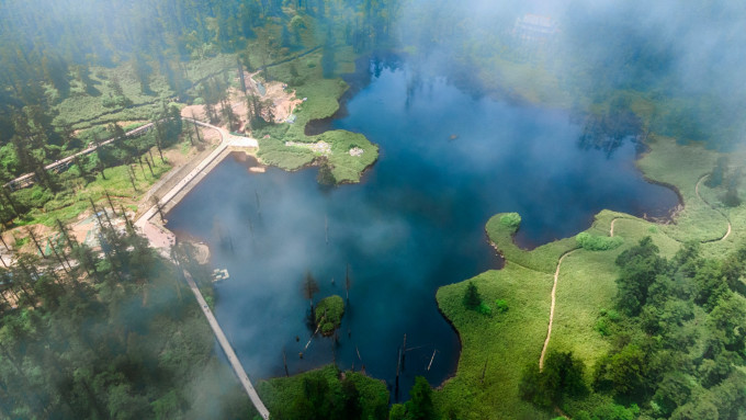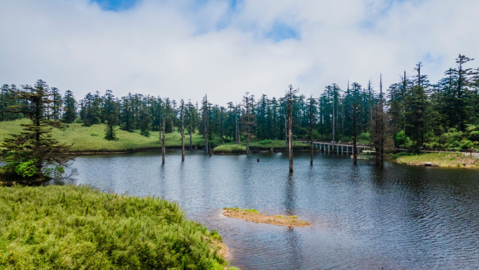 大概又走了20分钟平坦的步道,就可以看到鸳鸯池。不是亲眼看到,很难想象在瓦屋山高原平台的中心,居然有面积约100亩的湖泊,也是鸳溪和鸯溪的发源地。