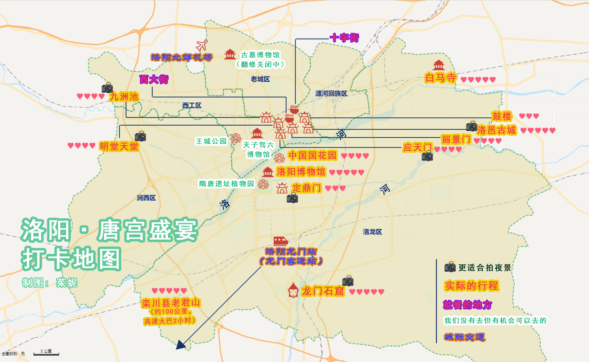 经过我五天半的游玩,整理出一张【洛阳打卡地图】,涵盖了大部分景点,它们的所处方位也一目了然,供大家仔细研究、合理安排行程: