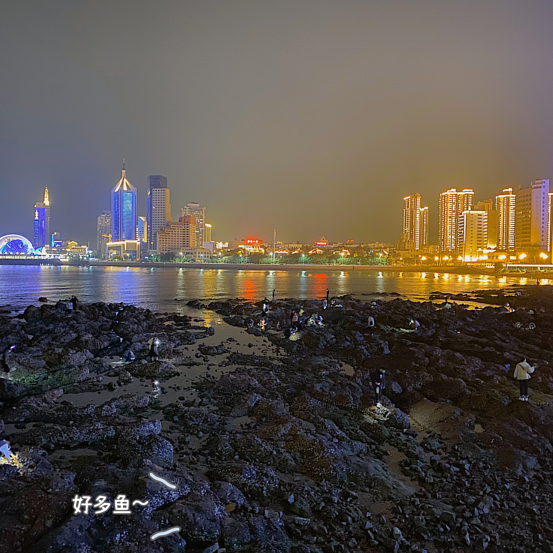 已是夜晚,礁石间许多人在拣螃蟹?人来人往,大人聊天,小孩嬉闹,很是热闹呢。