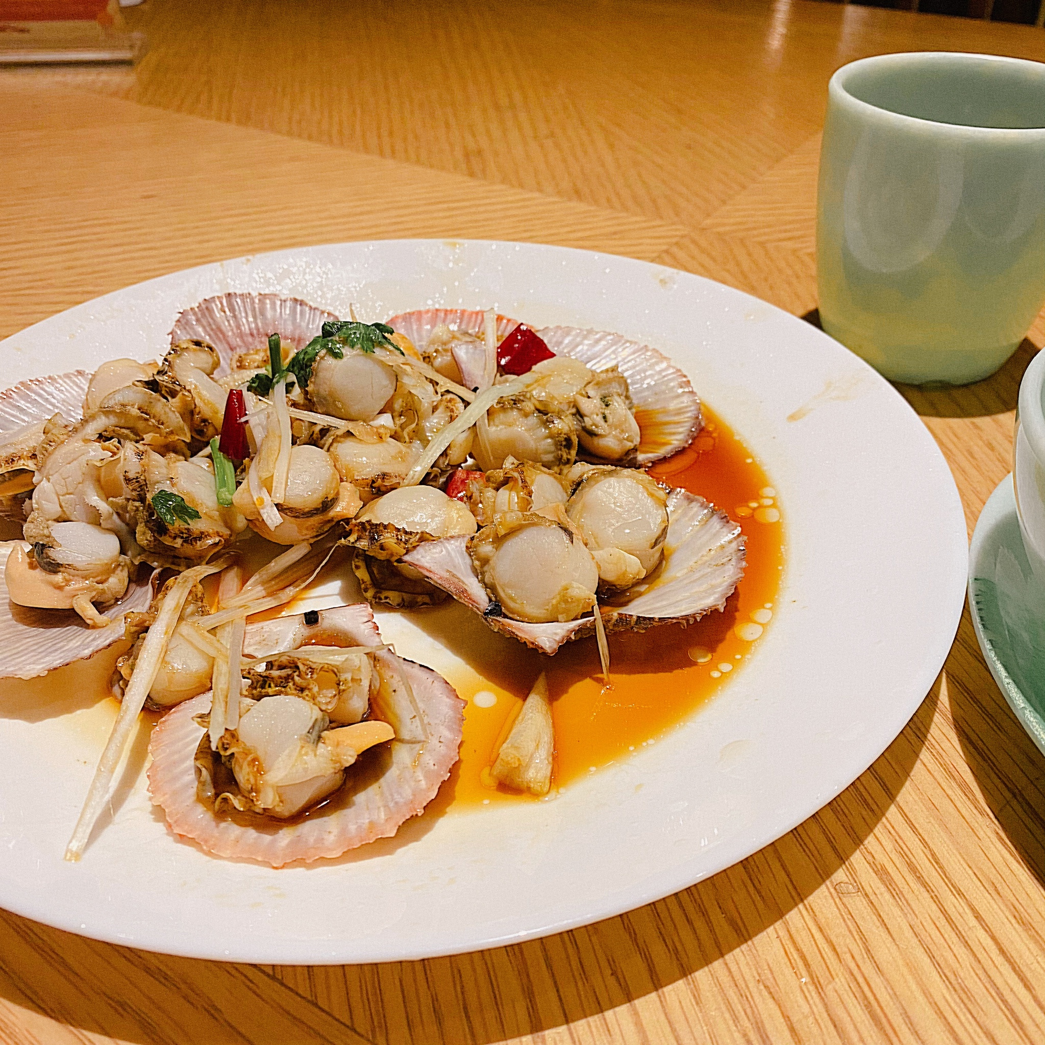 油泼扇贝:扇贝很新鲜,吃起来口感也很好。