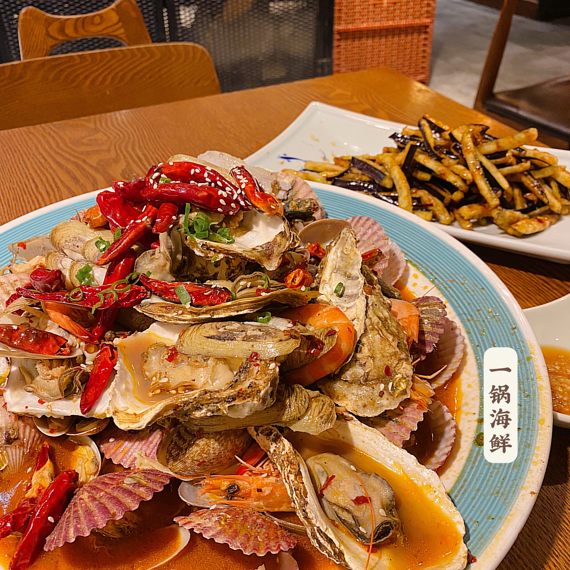 麻辣一锅海鲜:各种海鲜一起炒,味道一般感觉,两人不建议点。十五最后吃到捂脸。