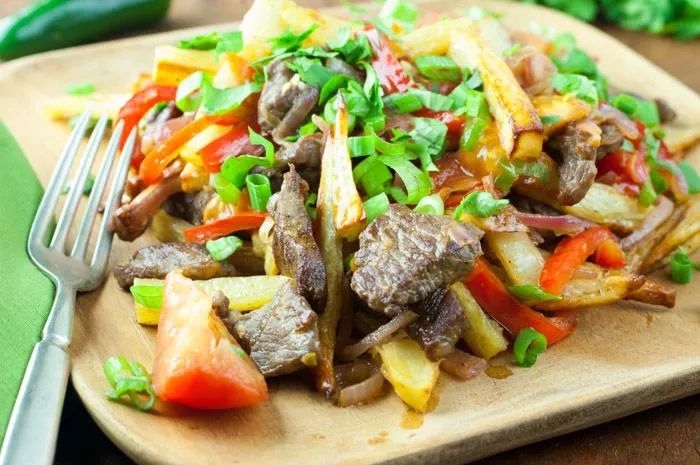 炒牛肉这道中国菜在秘鲁非常受欢迎,烹饪方法也没有改变太多,将腌制过的牛肉与西红柿、洋葱、大蒜、辣椒一起翻炒,再加入酱油和香菜调味,最后搭配炸马铃薯和米饭一起食用。
