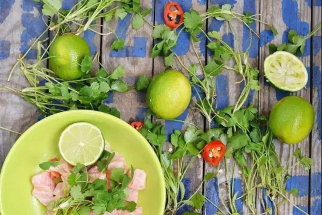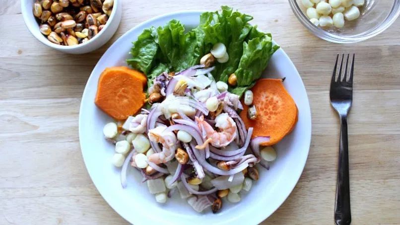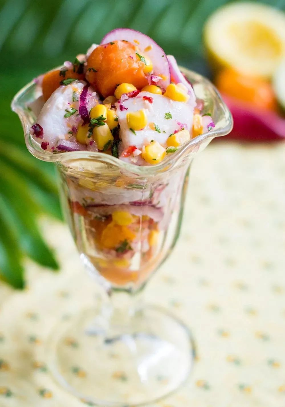 在新鲜的鱼肉中加入柠檬汁腌制,配上洋葱、玉米及各式蔬菜,佐以少许辣椒调味。腌制后的鲜鱼肉外韧内柔,嚼起来劲道爽口,酸中带甜,是不可多得的开胃菜。