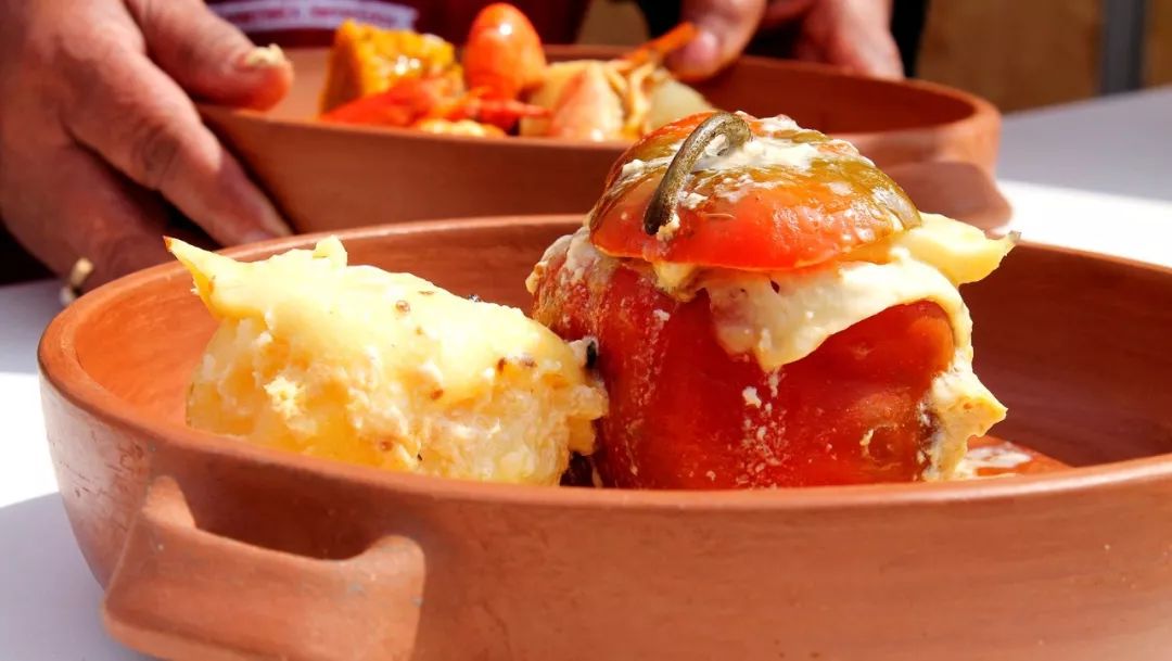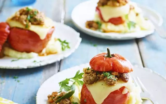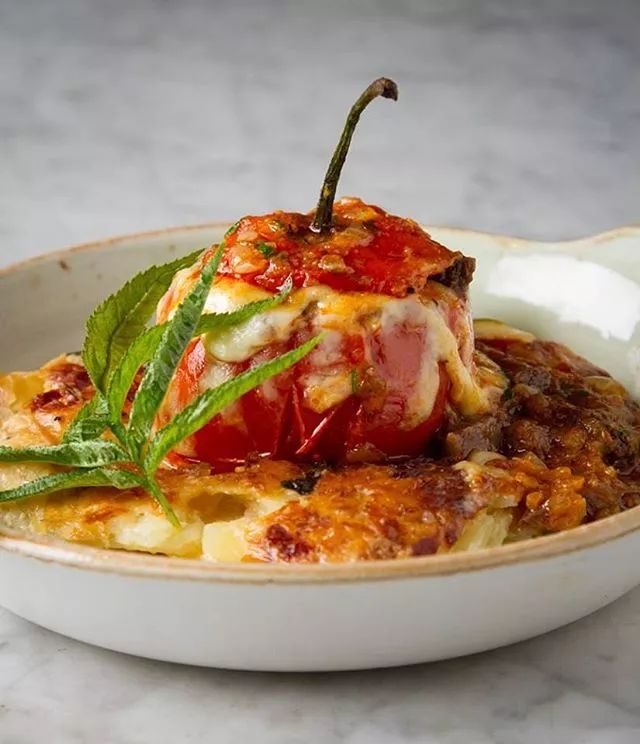 将辣椒去籽后,在里面填充牛肉馅、橄榄、豌豆、碎葡萄干以及各种香料,盖上一块奶酪,淋上蛋奶液放入烤箱烤熟,最后配马铃薯上桌。