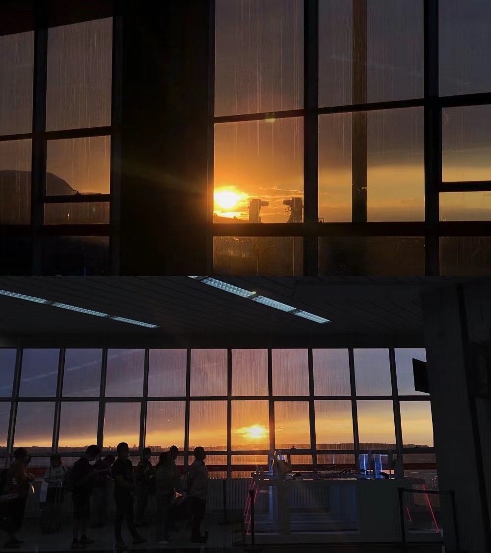 9点多落地,太阳依然红彤彤挂在天际线上。这时的阳光特别美