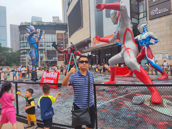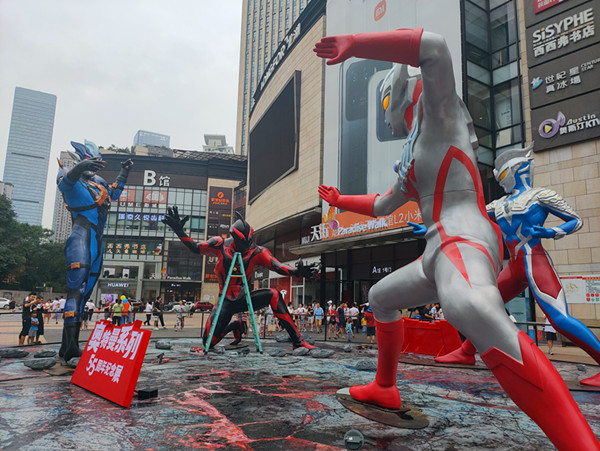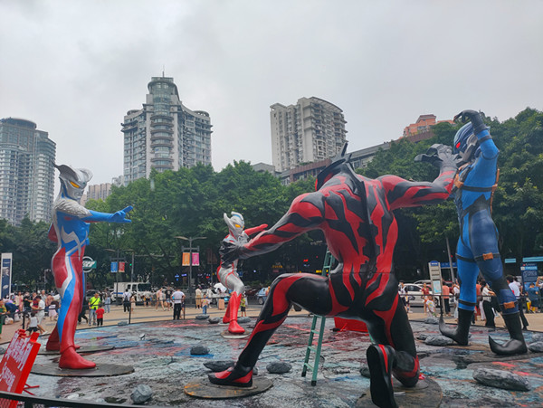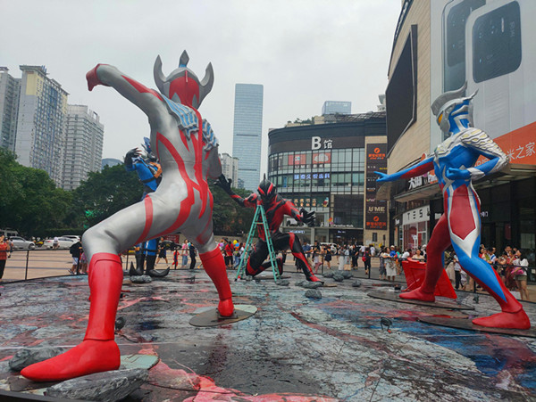 在时代天街A馆的英雄广场的5米对战雕塑群上,泰迦奥特曼、贝利亚奥特曼、托雷基亚奥特曼与贝利亚奥特曼集体现身