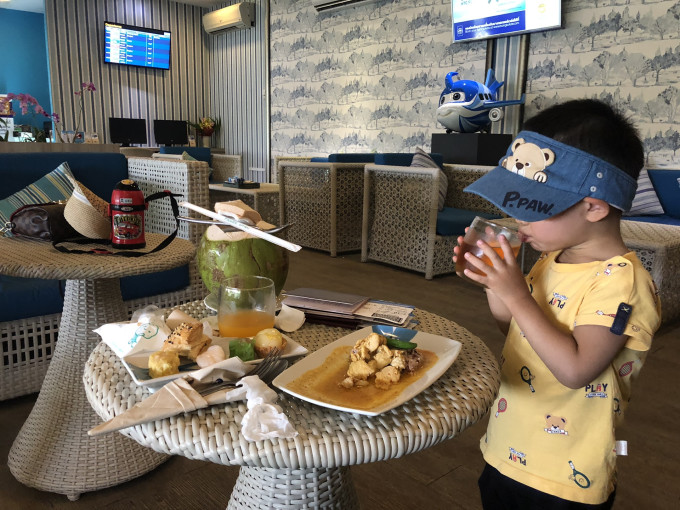 重点了,国内机场贵宾室的餐食和苏梅岛机场比真的是弱爆了,苏梅机场可以点餐,并且果汁都是鲜榨的,只是在苏梅机场换登机牌时,工作人员不知道是出现了什么问题,等了将近一个小时才拿到机票,真是急死了,和工作人员用英文对话想问问什么原因,她说的英文我都听不太懂,我以为是我水平太low了,用翻译软件也翻译不出来,后来给西藏航空客服打电话,找了个国际客服对话,国际客服很无奈的和我说她也听不懂她的泰式英语,最后也不知道到底是什么原因卡在了婴儿票上,她只是一遍一遍的和我说Don’t worry,撕了两遍作废的机票,本来提早来机场,为了在机场贵宾室吃午餐,顺便逛逛免税店买点东西带回去,结果计划全泡汤了,过海关的时候我抱着弟弟又出现问题,不知道什么原因,又卡了十分钟,真是泰囧啊,这个时候已经开始登机了,二叔先带着哥哥到贵宾室简单吃点东西,免税店进去看了一眼,很小,感觉东西很贵,也没时间买了