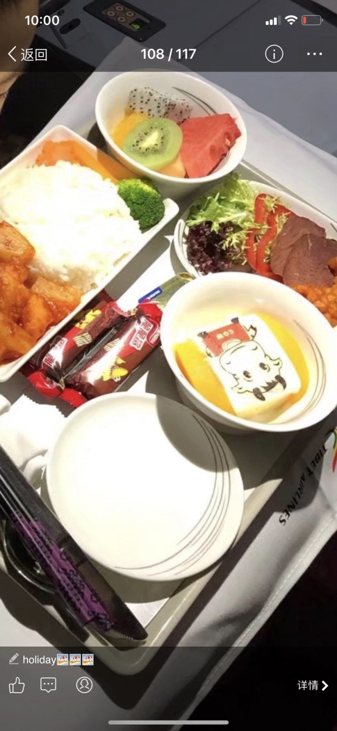西藏航空往返公务舱都是只有我们四个人,还是挺好的,给哥哥提前申请的儿童餐,儿童餐只有主菜和蛋糕和我们不一样,外加两个巧克力威化,主菜往返都是番茄虾仁,给弟弟申请的婴儿餐,亨氏的菜泥两瓶