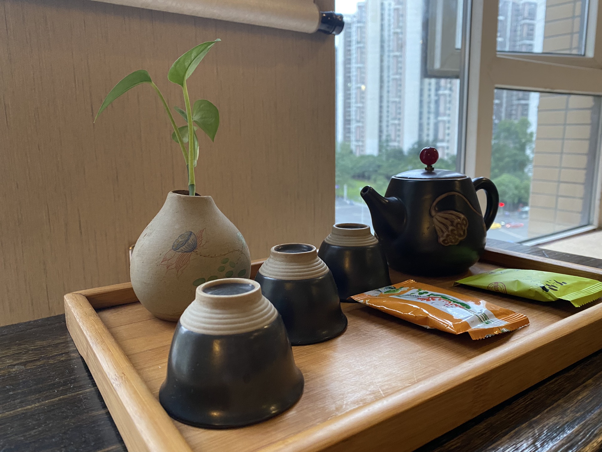 不得不说,成都是一个让人觉得非常舒服及惬意的城市,街上行人步履悠悠,绿树成荫,进入房间首先映入眼帘的就是一个飘窗,上面一个小茶桌,摆着茶具,墙上还挂着字画,房间硬件设施一般,但感觉就很棒!