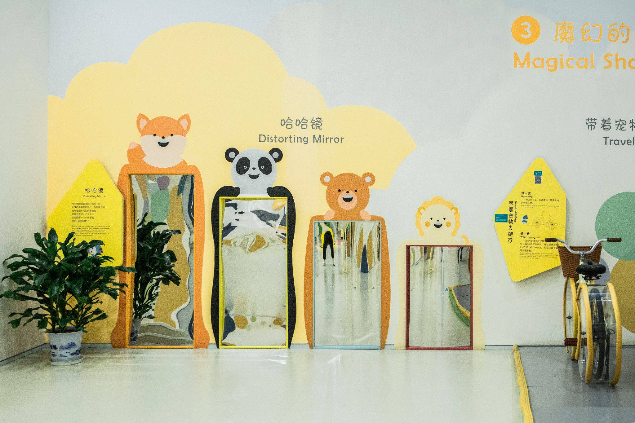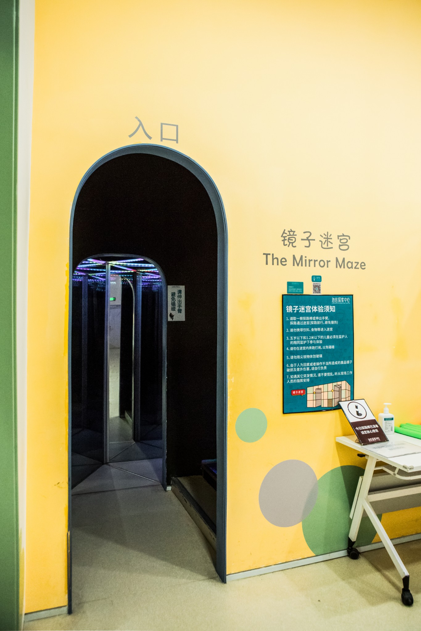 魔幻的光影展区通过镜子迷宫、万丈深渊、倾斜小屋、万花筒等展项,向孩子们介绍了光的折射与反射、视觉暂留和三基色原理等。