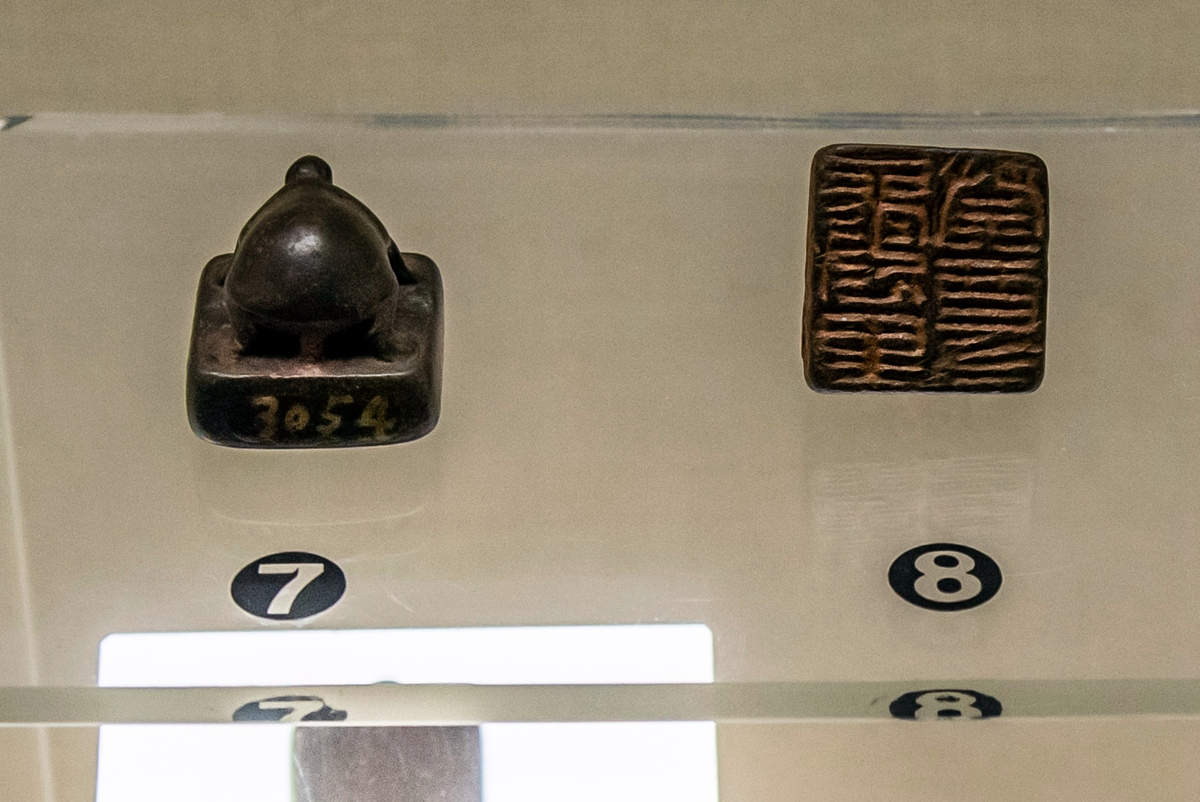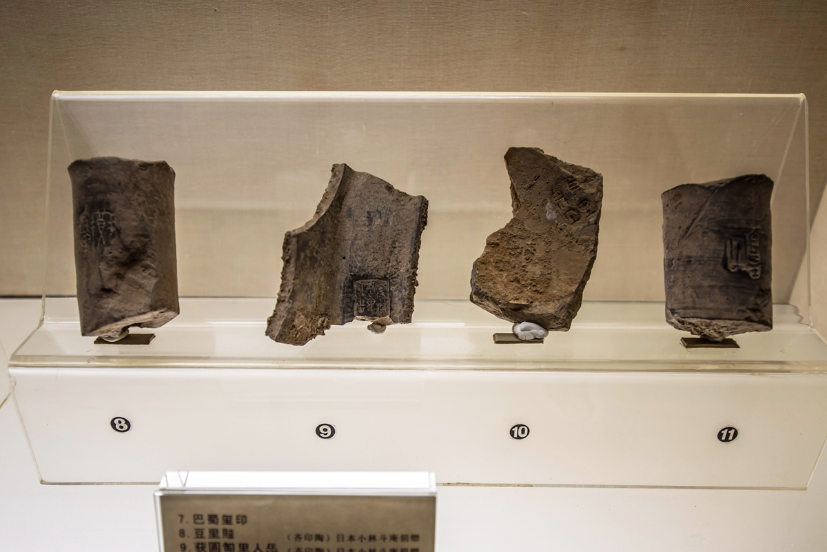 (下图左)西周火纹铜玺,(下图右)印纹陶片
