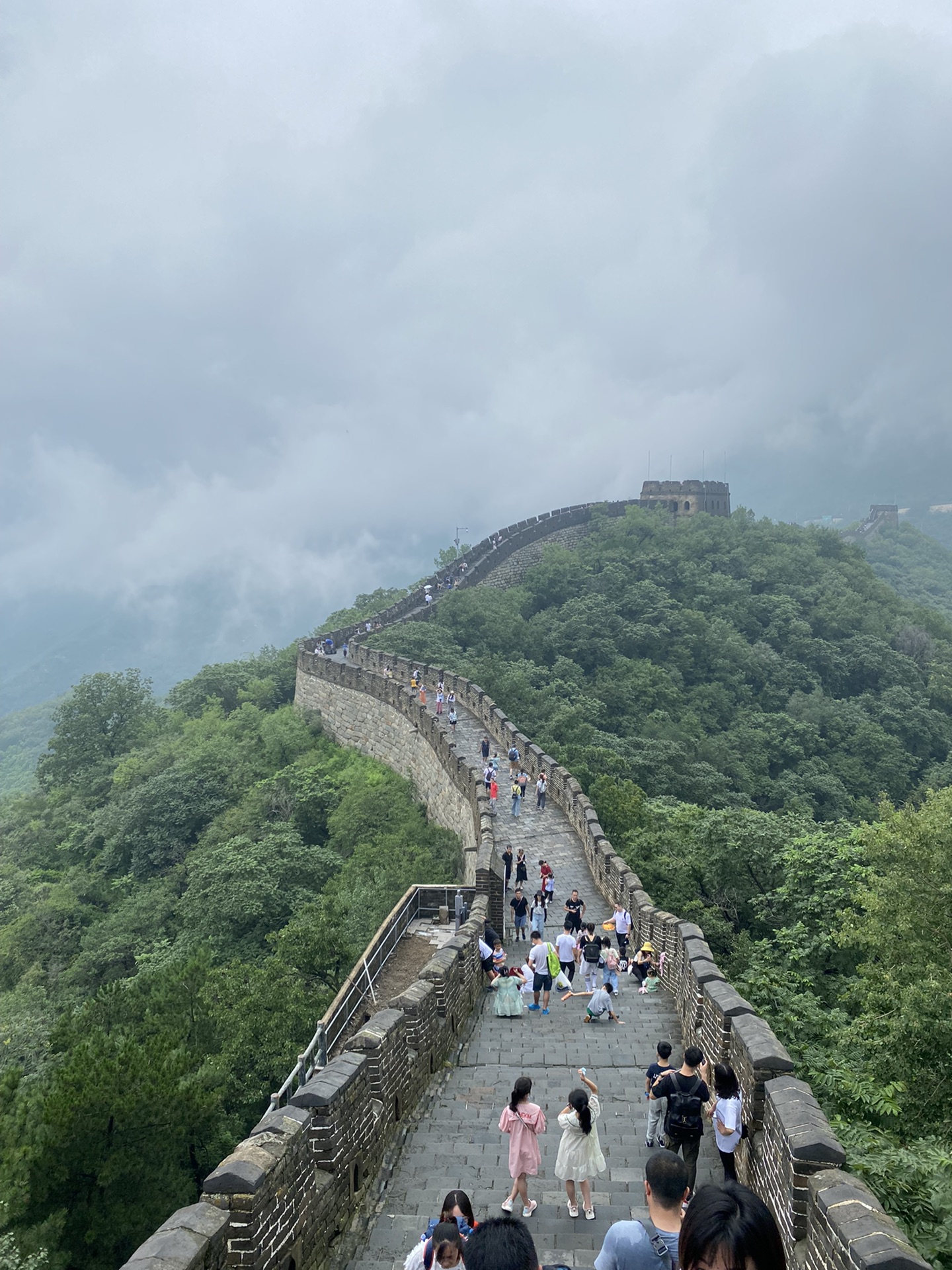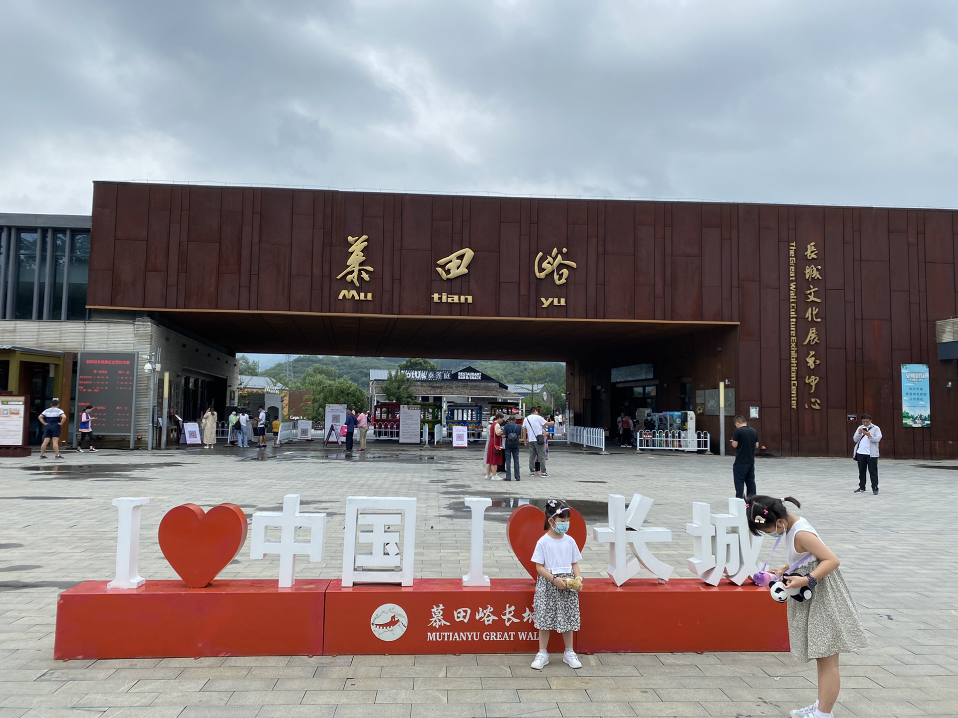 天气阴。因为听说八达岭人多为患,选择了慕田峪,距离酒店一个多小时车程,有停车场方便停车,门口红色的慕田峪的大牌子,走一段坐摆渡车,然后再走一段,坐索道缆车或步道的入口,我们选择的是坐缆车,提前一天订的套票。缆车在郁郁葱葱中坐到14炮台,当天关了最高的几个炮台,我们爬了一个多炮台有点下雨就坐缆车回了。