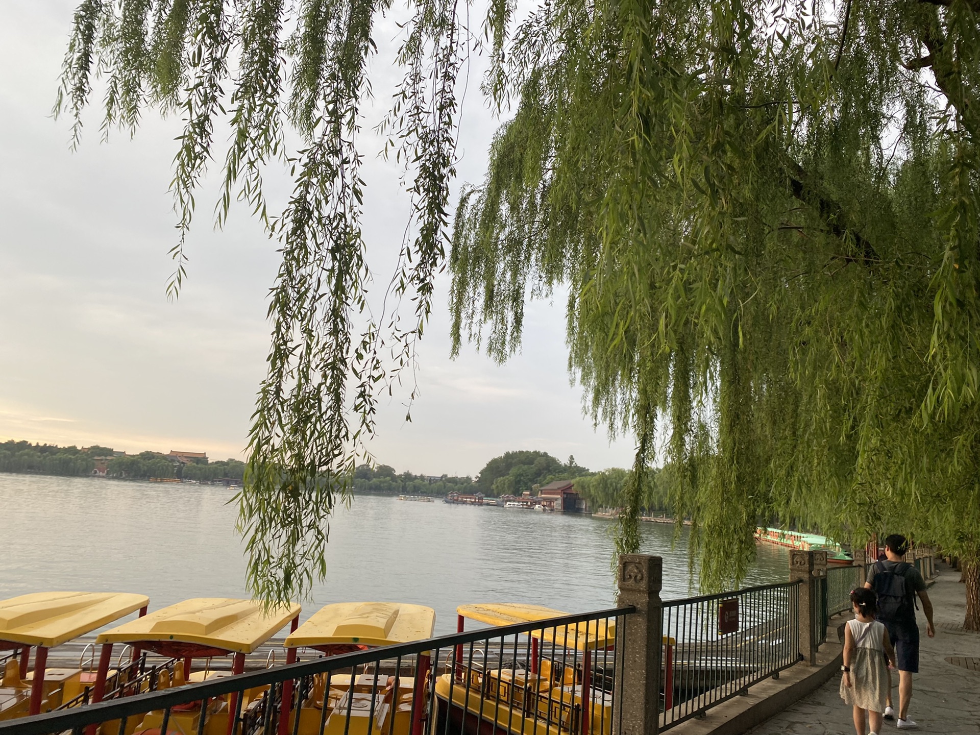 从景山西门下来穿过一个路口就是北海公园,我们到的那个时候已经七点多了,北海公园的划船七点停船,没有赶上,有点小遗憾,北海公园里走走很舒服,夕阳西照,凉风拂柳,荷叶茂盛,荷花盛开。