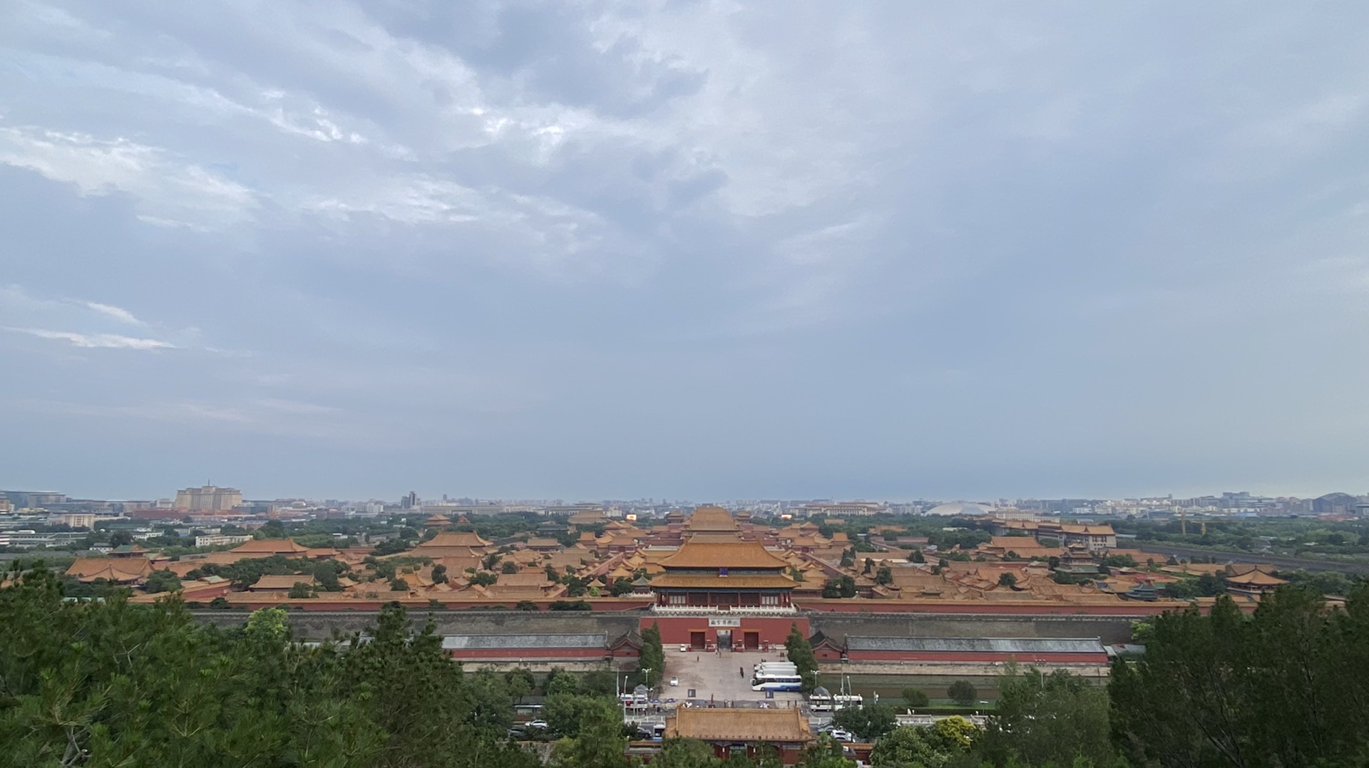 开车回去的路上,碰到大暴雨堵车,到酒店歇了一会就出发景山公园了。因为故宫的门票只抢到了第四天的,先提前远眺一下。景山公园不大,就在故宫北面,神武门正对,我们从东门爬到山顶万春亭十来分钟,有最佳观赏点。