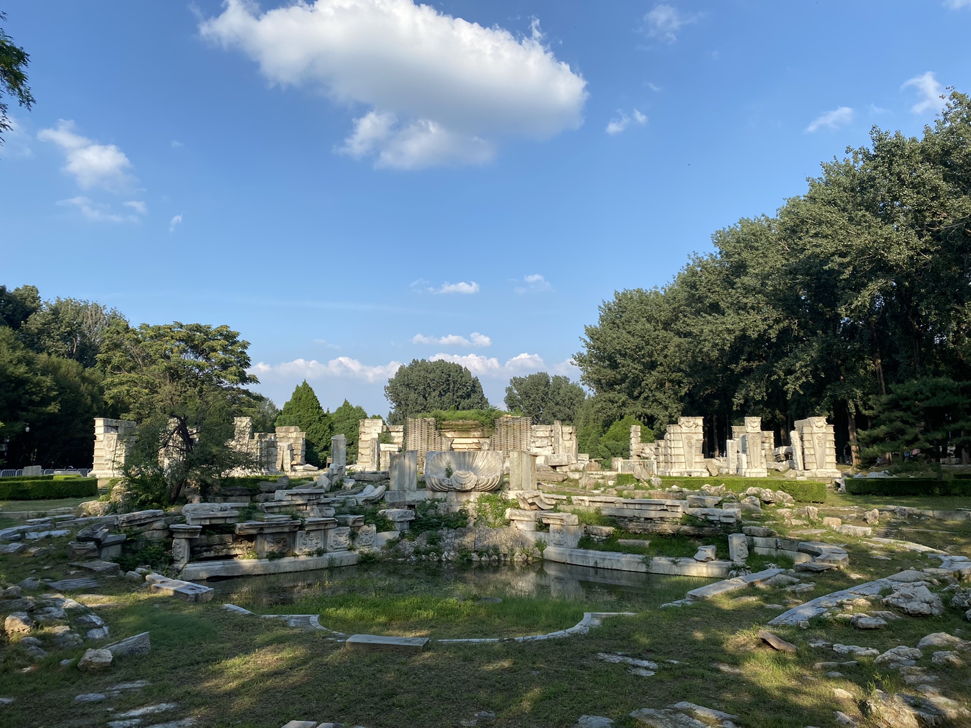 圆明园和颐和园紧挨着,本来计划行程是两个都要逛的,结果圆明园里走的太久,又晒又热,两个娃都走不动了,踩了一会四轮自行车。西洋楼里残垣断壁还是挺有触动的。我也是进去了才知道,仅占圆明园五十分之一的西洋楼因为采用岩石建造,所以得以保存,其他中式建筑在那场掠夺和大火中都被损坏了,所以园里只能看到郁郁葱葱而不见亭殿。