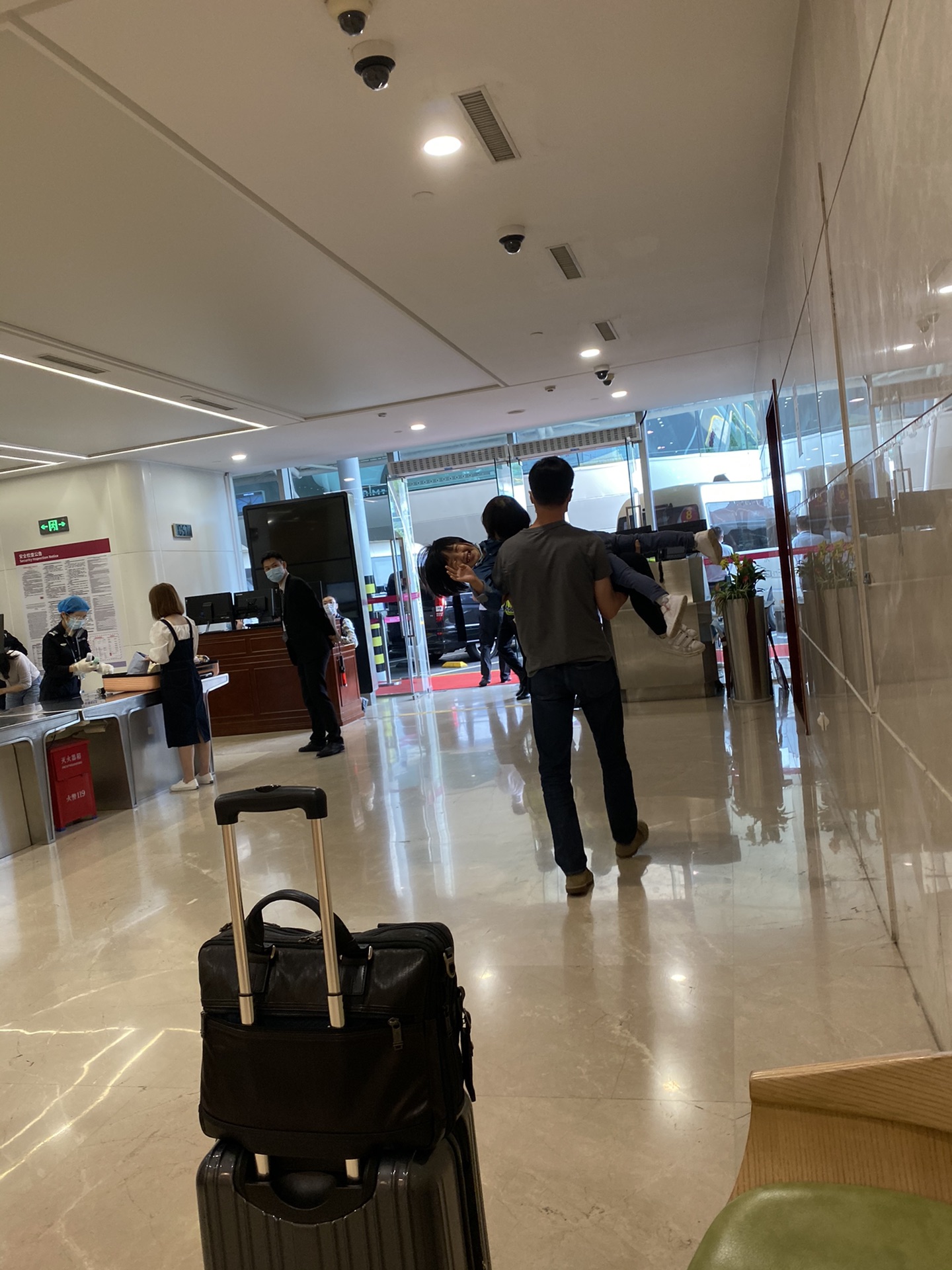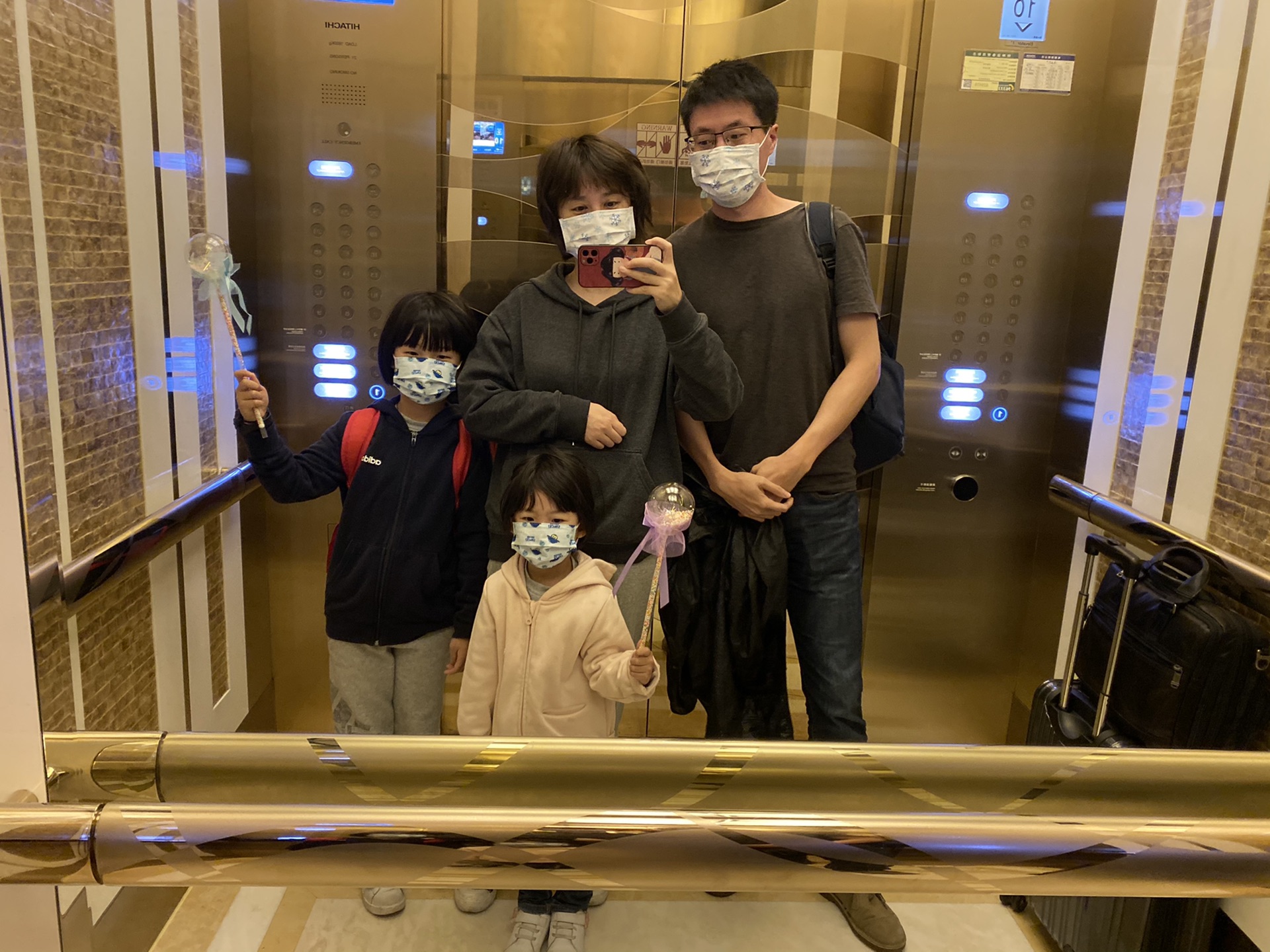早起赶早班机,还是挺辛苦的。电梯里的我们还笑得出来