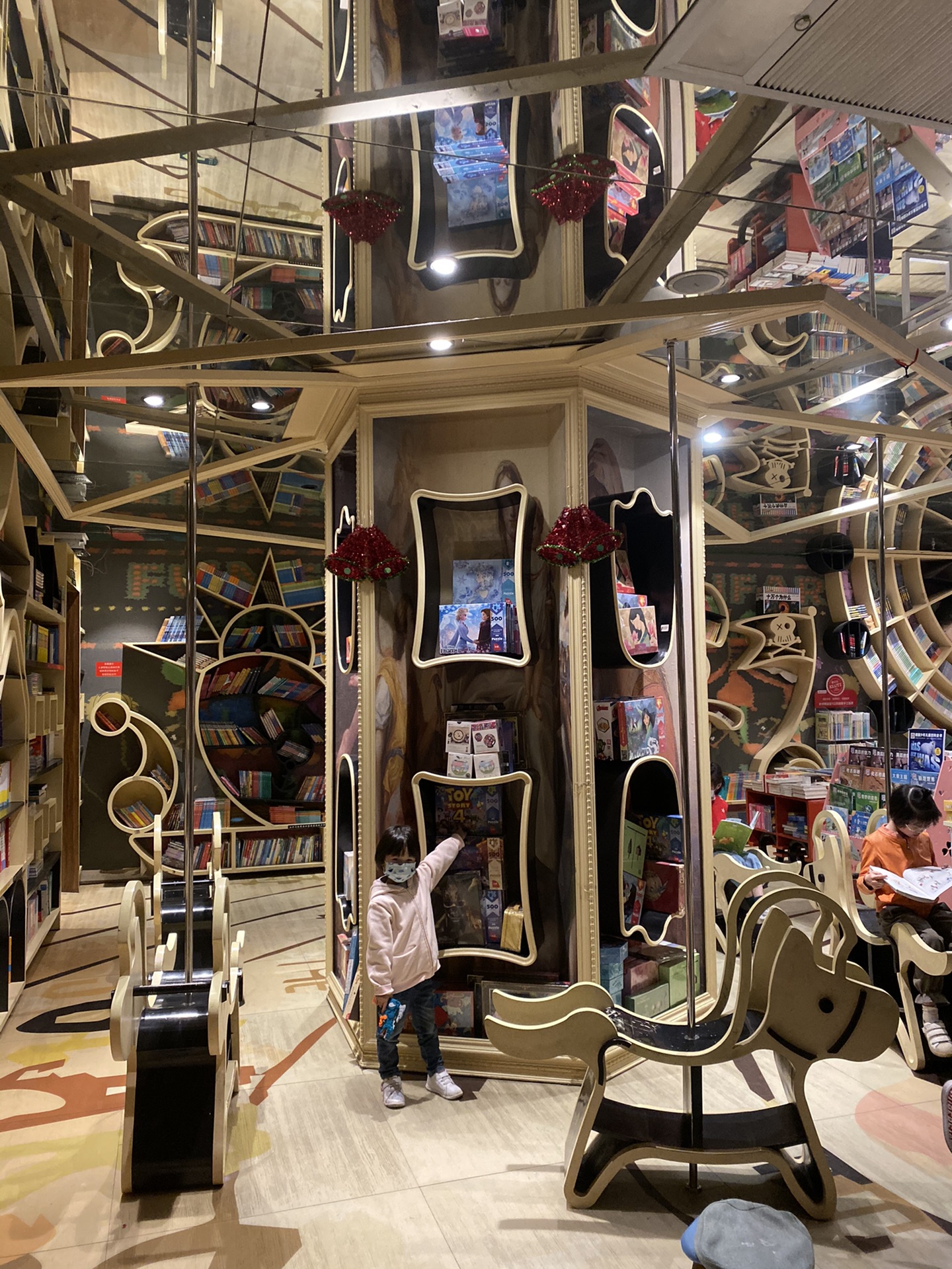 看两个小家伙多新奇,看书多认真。有一个小的童书馆,里面有小木马,可爱的装饰,小朋友一进去就喜欢得很。静静地看了会书,喝了点东西,吃了点点心,心旷神怡。