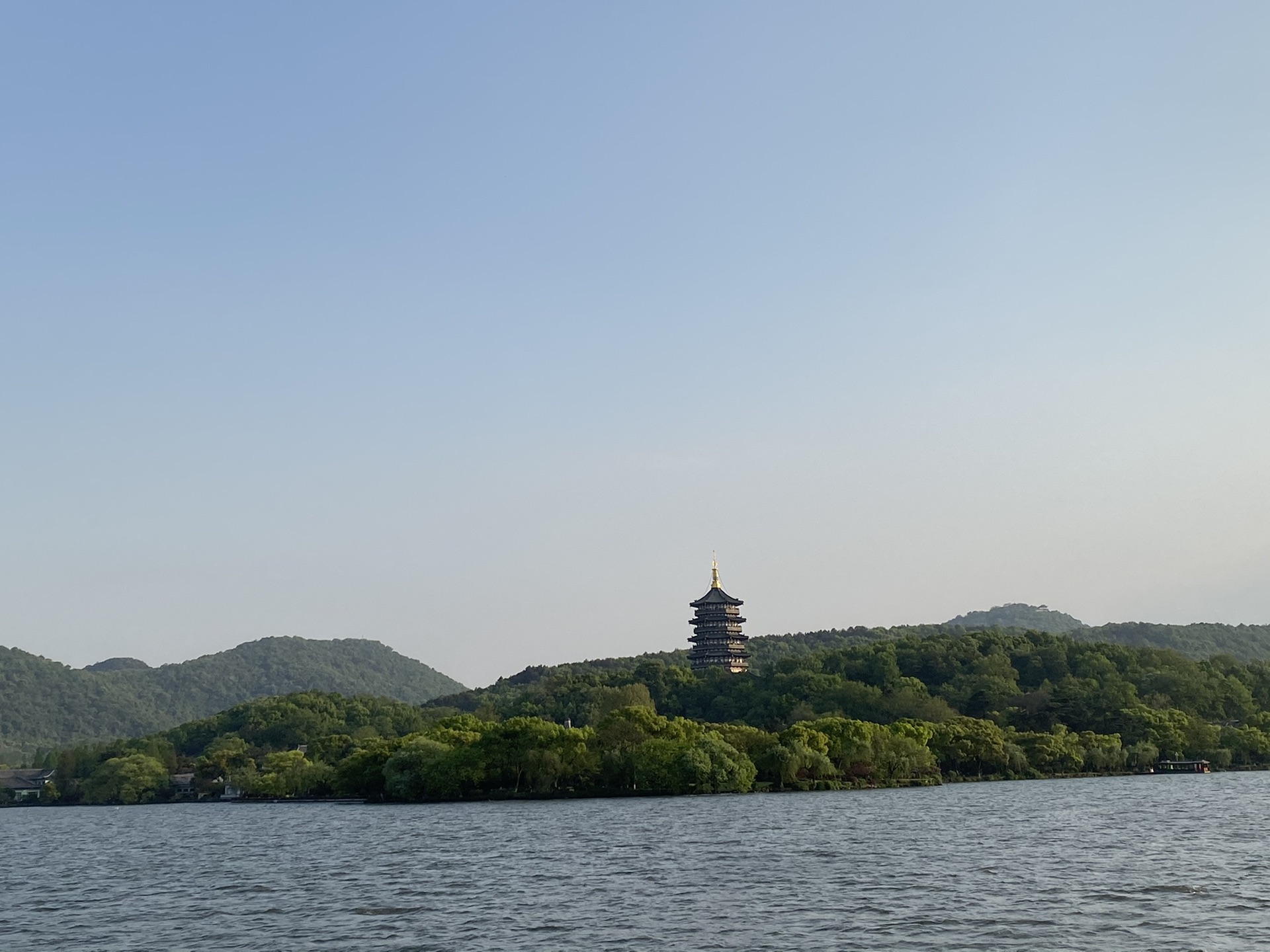 打车到西湖边上后,沿着湖边走走,哪哪都是人,看到有游览车,抢不到座,走到心灰意冷,然后没办法又坐了个大游船。这个船将西湖一圈都游到了,边游边讲解,从烈日当空游到夕阳西下,船上人多,都挤在二楼船头拍照,体验感一般,但比起那些湖边挤来挤去走断腿的感觉还是好多了。