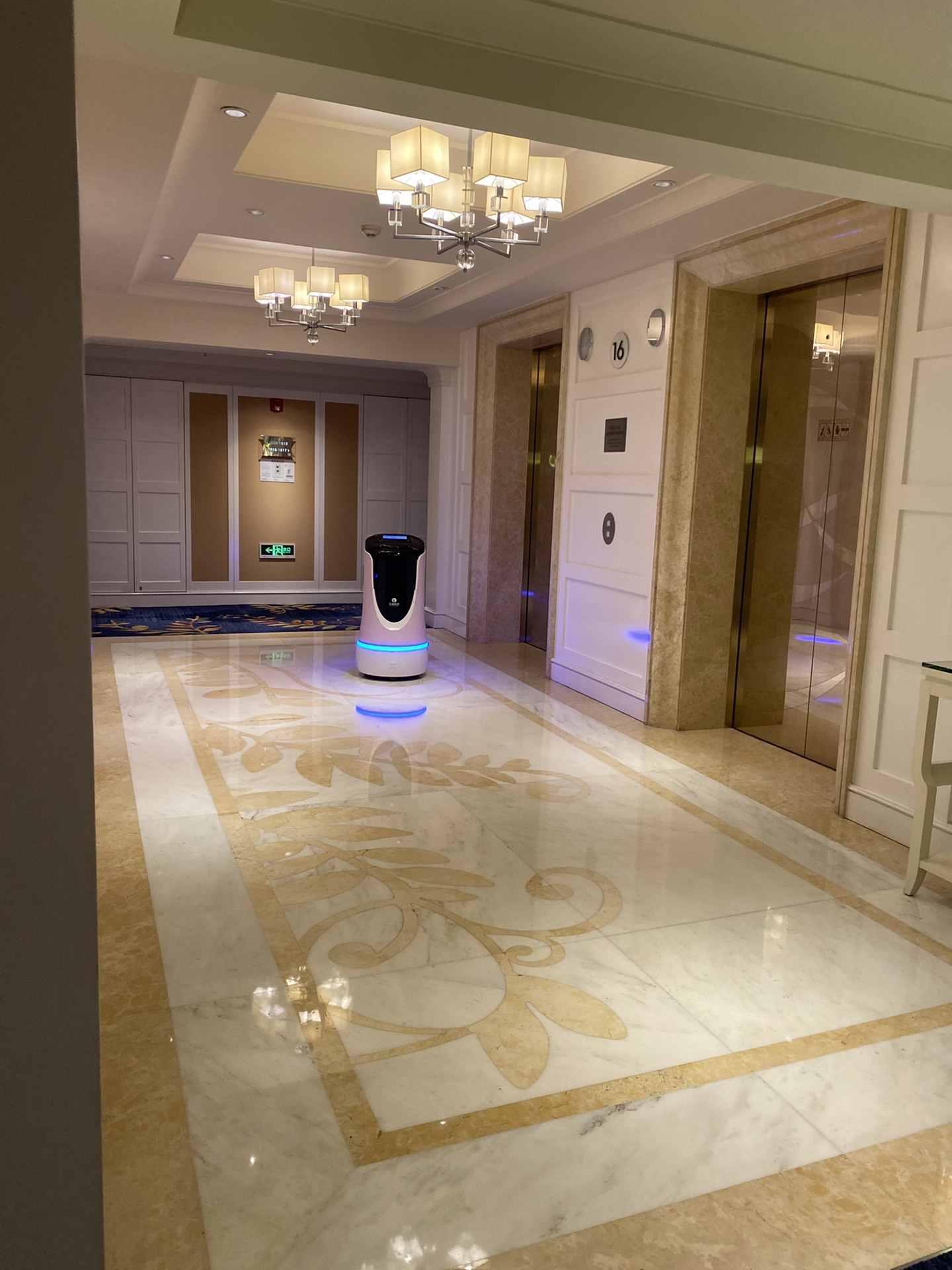 回到酒店竟然碰到了坐电梯帮送东西的机器人,可爱得很。