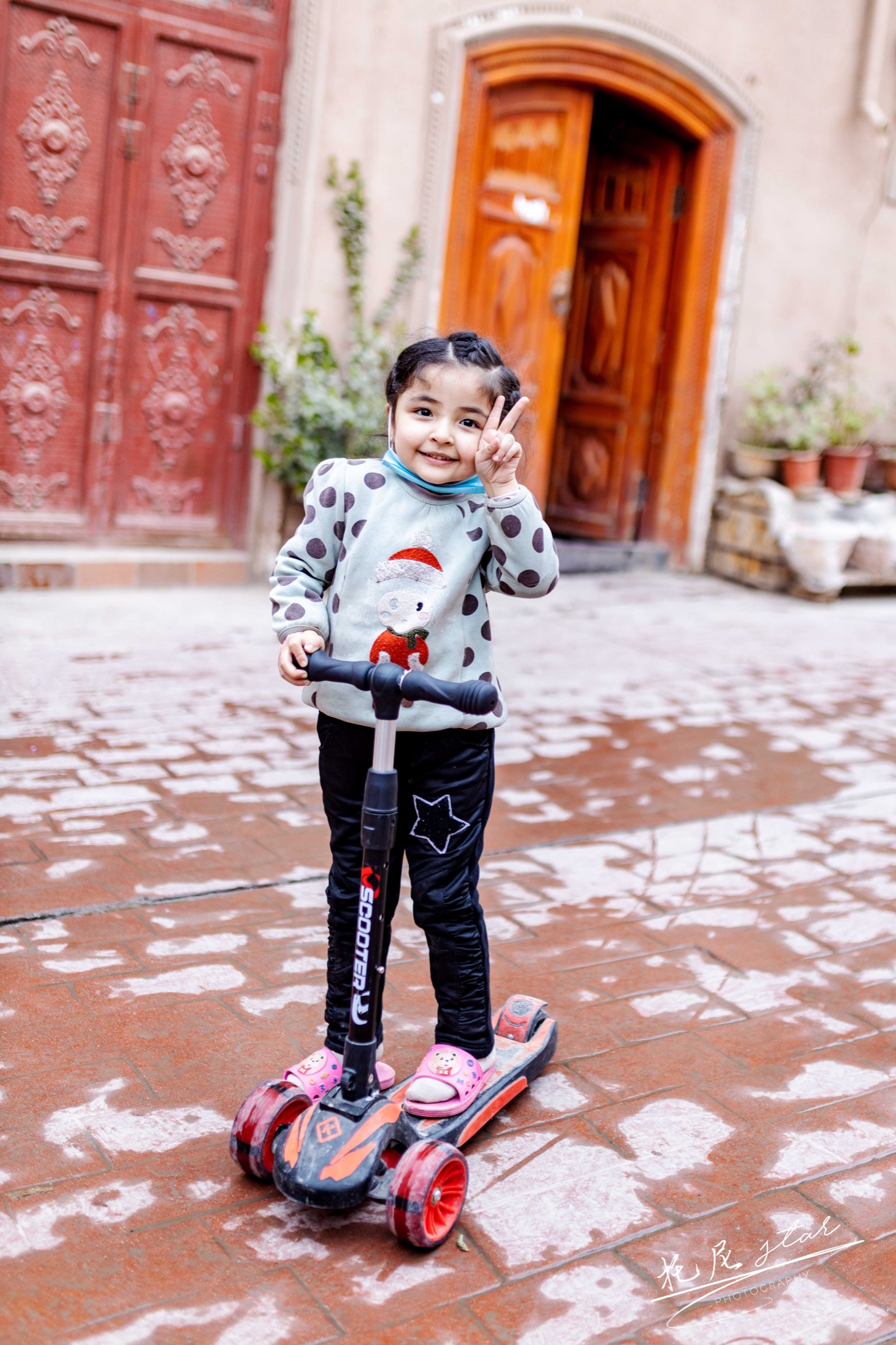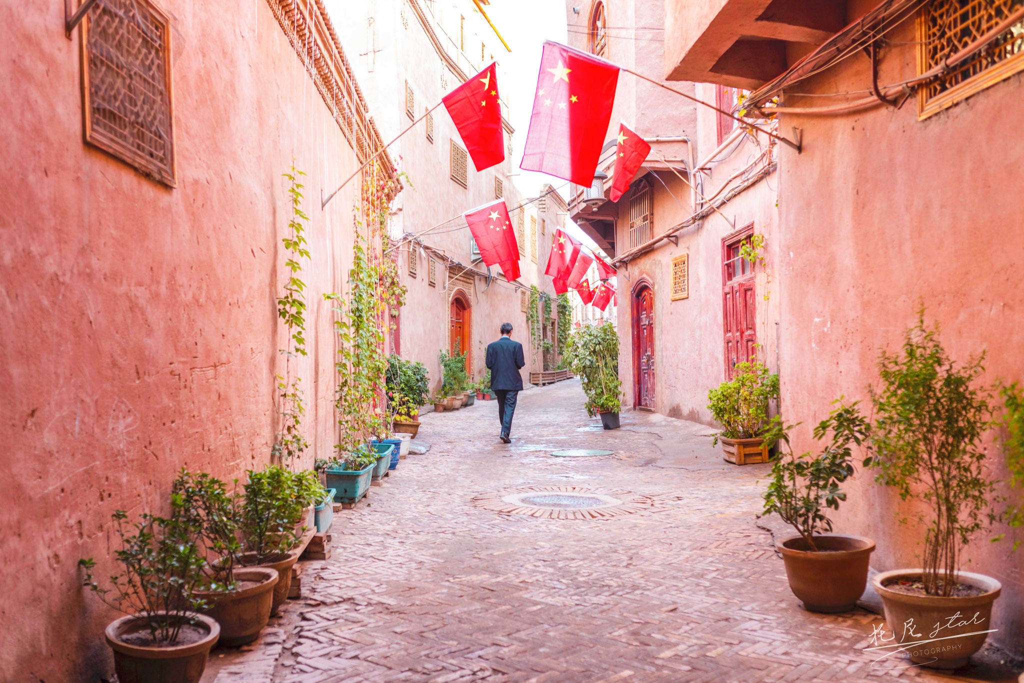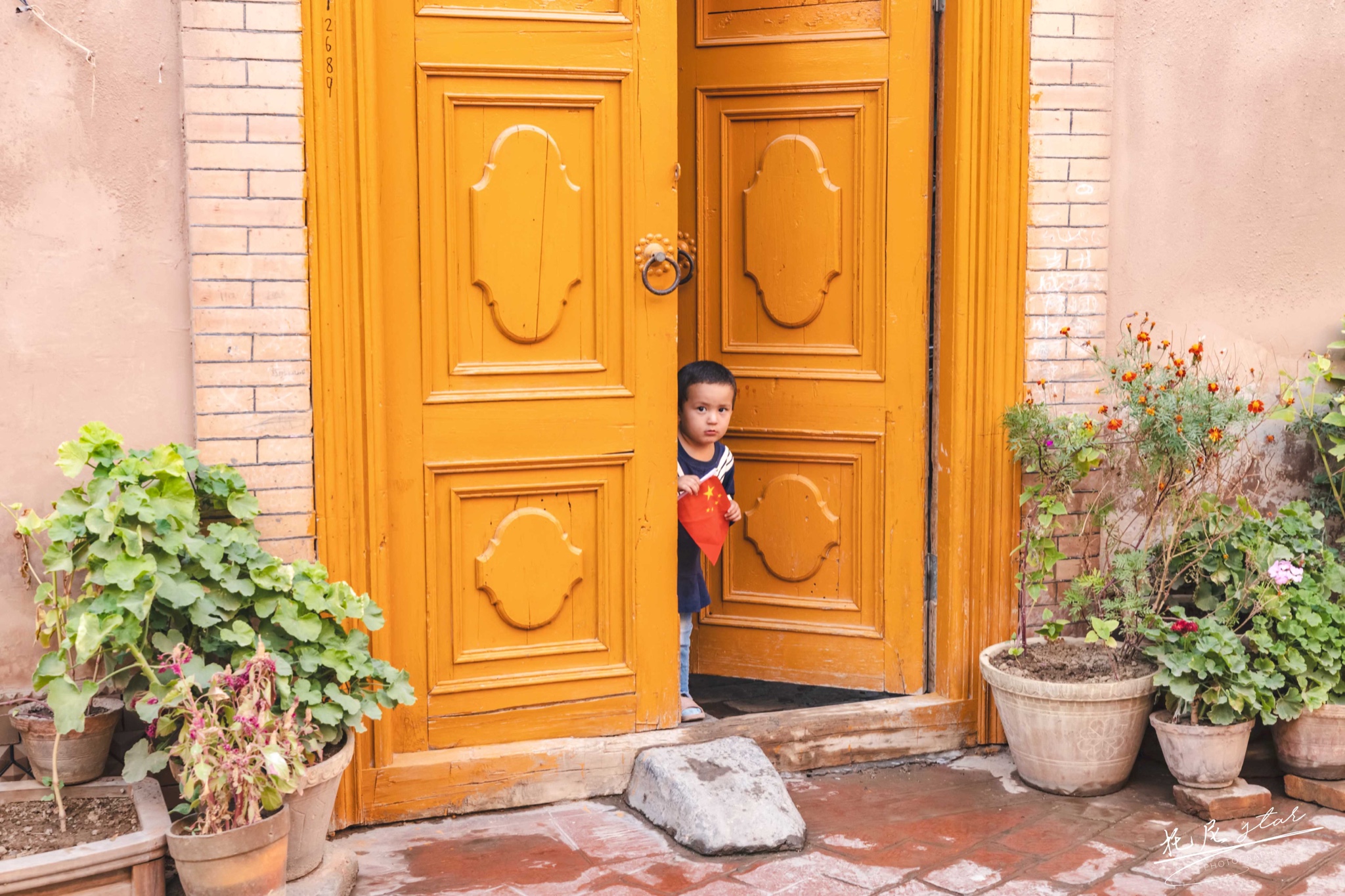 第二次来到喀什,是国庆期间,古城洋溢着国庆到来的气氛,到处插满了五星红旗。躲在门后面拿着红旗的小朋友,很好奇远方来的我们,特别的可爱。