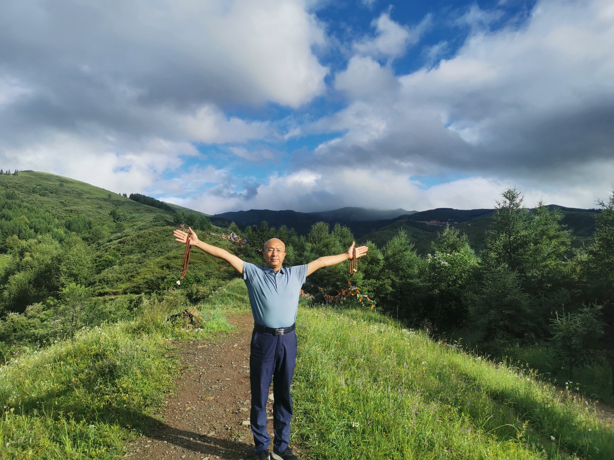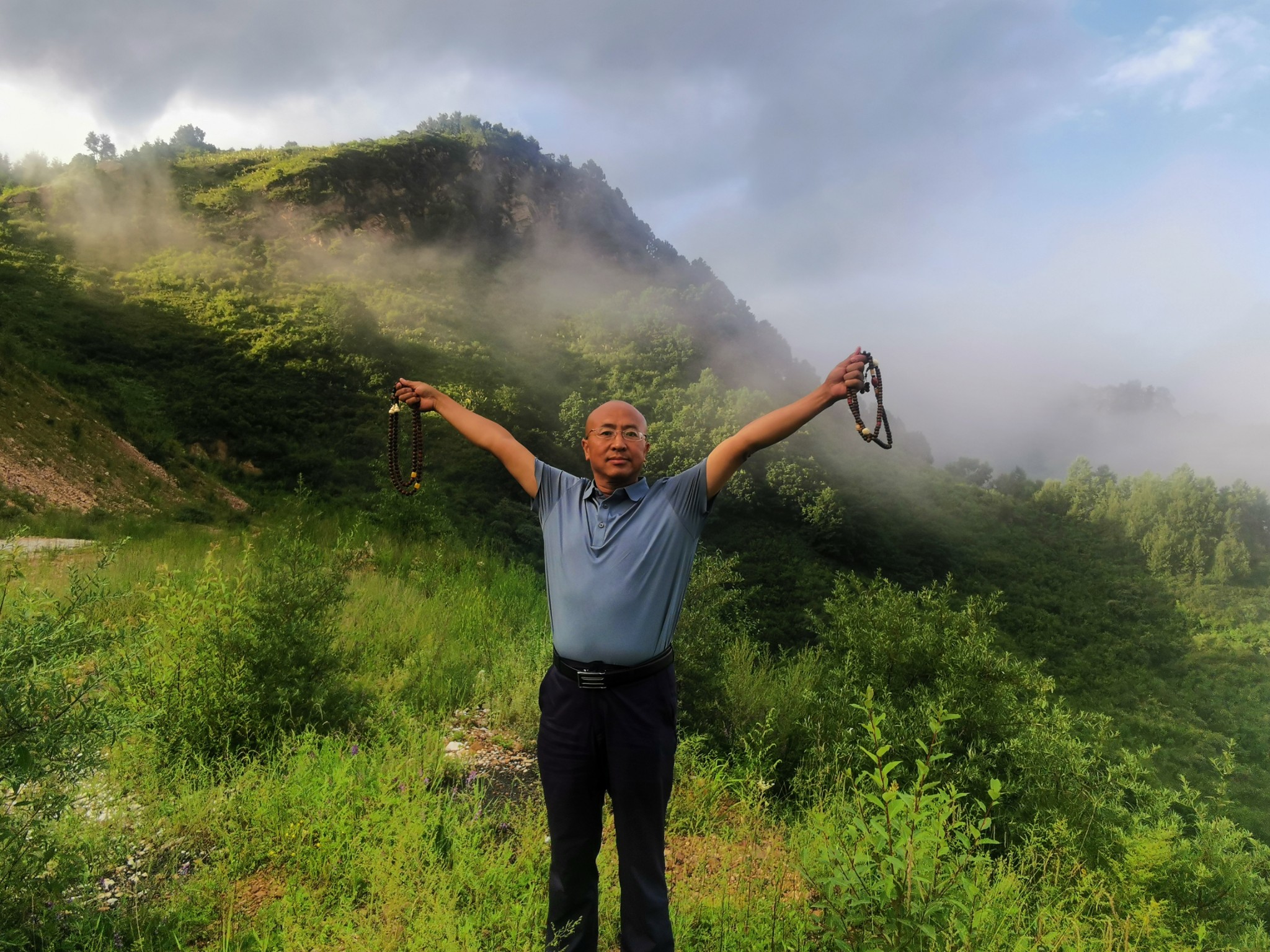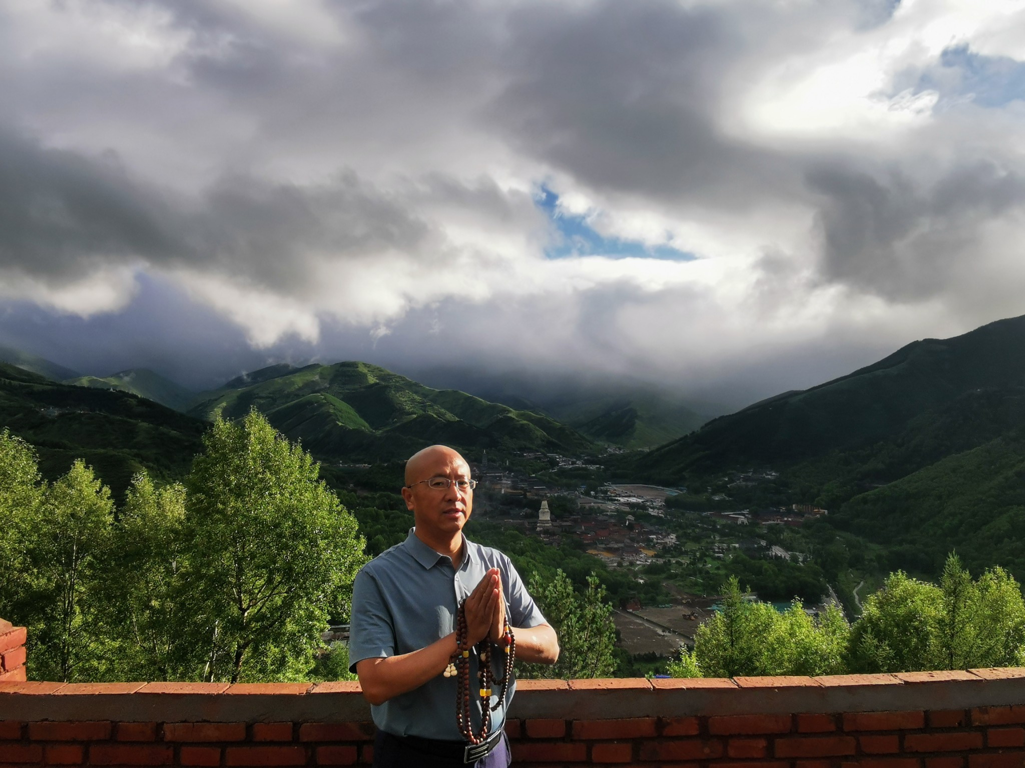 7月12日早起后先去了五爷庙朝拜后,开始爬梵仙山,【梵仙山】 五台山山名。亦名饭仙山。中台顶灵迹之一,位于台怀镇。梵仙,是仙人的一种。古印度泛称一般的圣人为仙人。仙人世袭,是在神、人、阿修罗(恶神)以外的似神如人的人物,并被赋予极大的神通。仙人一般分三类,出身于神的称“天仙”出身于婆罗门(种姓名)的称“梵仙”,出身于刹帝利(种姓名)的称“王仙”。梵仙山原称饭仙山,为五台山早期道教活动的场所。佛教独占五台山后,易饭为梵,称为梵仙山。登临山巅,西望:风林谷蜿蜒曲折,通向中台顶,虔诚的朝山者行走在山谷中,步步登高,犹如上西天。东望:清水河宛然一条洁白的哈达,成为各民族团结的象征。北望:台怀镇全景尽收眼底,心旷神怡。远眺罢,收心敛神,歇地小卧,又会惊喜周围繁花似锦,看群蝶飞舞,听百鸟放喉。不时间还会有小松鼠跑到面前举手作揖,心头自会涌起“尘机尽向闲中息,诗兴多从静中来”的感情。金人元好问诗咏梵仙山说:“灵蛇不与世相关,时复蜿蜒水石间。何处天瓢待霖雨,一龛香火梵仙山。”欲登梵仙山,出殊像寺牌坊,过万水泉小亭,稍往右拐便踏上一条云梯般的山道。无论春夏秋冬,你只要登临,就会觉得举步登高,浑身漫汗。走乏了,可在山问小息,吸一口微微山风,便感神清气爽。放眼望,从鸿门岩盘桓而过的那条水泥公路婉蜒曲折,像一条银灰色的玉带飘入台怀镇;清澈明净的清水河缓缓流去,直到看不见的尽头。再往上登,台怀景观皆可人目。大白塔在红墙绿树辉映下直插云端,黛螺顶、菩萨顶、寿宁寺与梵仙山遥遥相对,恰似四位端坐的高僧向着大白塔频频对拜,祈祷众生安宁。那台内景象,自有情趣,寺宇梵宫,错落有致,苍松翠柏,交相掩映,钟鼓声声,梵音阵阵,浓淡相宜,静中有动,宛若一幅出自大手笔的神奇画卷:再把目光放开去,沟口尽头,白云生处的缕缕青烟里,灰瓦白墙的农舍依稀可见.远山近梁田林交织,牧坡上牛羊成群,放牧人清脆的鞭声不时响起,再伴以粗犷宏亮的山歌和或高或低的鸟鸣,简直使人如入仙境。现在顶上有一寺庙,名叫灵应寺,为清代遗物。寺宇坐西面东,北为正殿,二层,上层3间,供胡老太爷及其胡大太爷等六个儿子,供送子观音和善财童子、龙女,还有石刻带箭文殊1尊。下山返回酒店用过早餐后去往普化寺、普乐寺、东台沟的山神庙、水神庙,在水神庙买水桶打了几桶圣泉水。后去了护银沟,想去静音寺文殊禅林,以前去过因为修建,没能参观,这次去了没想到还在大修。只好离开,那就去往河北平山县,把上次遗留下的景点都一网打尽。于是从五台山去了平山苍鹭峰,苍鹭峰景区位于平山县合河口乡外大河村“驼梁国家森林公园”深山处。青山绿水,野花飞红,珍禽聚唱,瓜果飘香,陡壁间一棵三百年的油松树冠上居住着近百只国家二级保护动物——苍鹭,晨起暮宿,群起群落,引领着周边千百只苍鹭下河觅食,返巢歇息,景区内汹涌的卸甲河自北向南穿过幽深的峡谷,两岸峻岭逶迤、高峰插天、群山无尽。有珍禽生态观光区、峡谷漂流区、民俗休闲度假区及观光采摘区等总面积15平方公里,集凉、野、奇、秀、古、幽为一体。堪称“避暑乐园、仙鹤之乡、漂流佳境”。