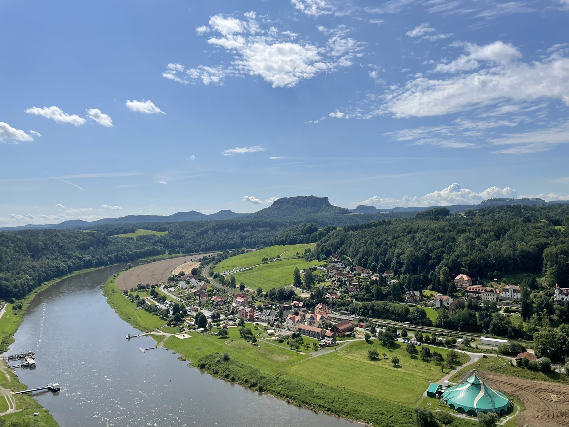 之后就要离开观景台,原路返回到主干道,然后沿着主干道继续前行,到达大桥。在桥上可以看到山下缓缓流动的拉贝河,偶尔还有蒸汽船发出巨大的汽笛声。