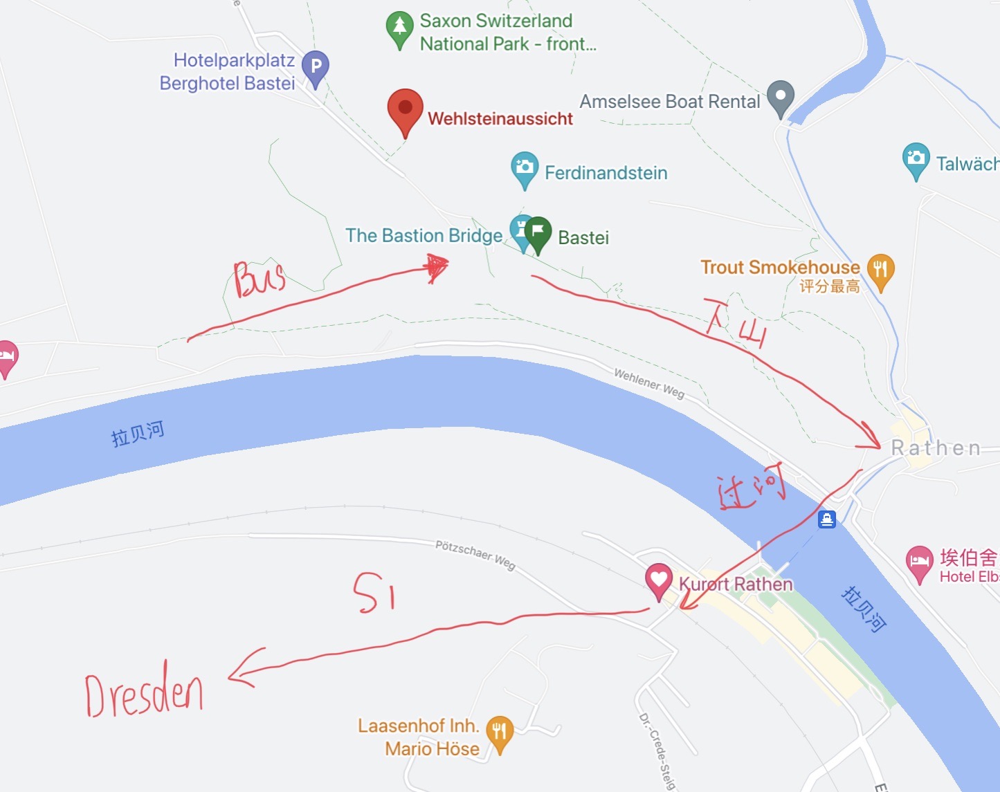 过了河可以去火车站Kurort Rathen, 搭乘S1火车直接抵达德累斯顿主火。在谷歌地图上搜索不到这班车,必须用德铁App来查看。